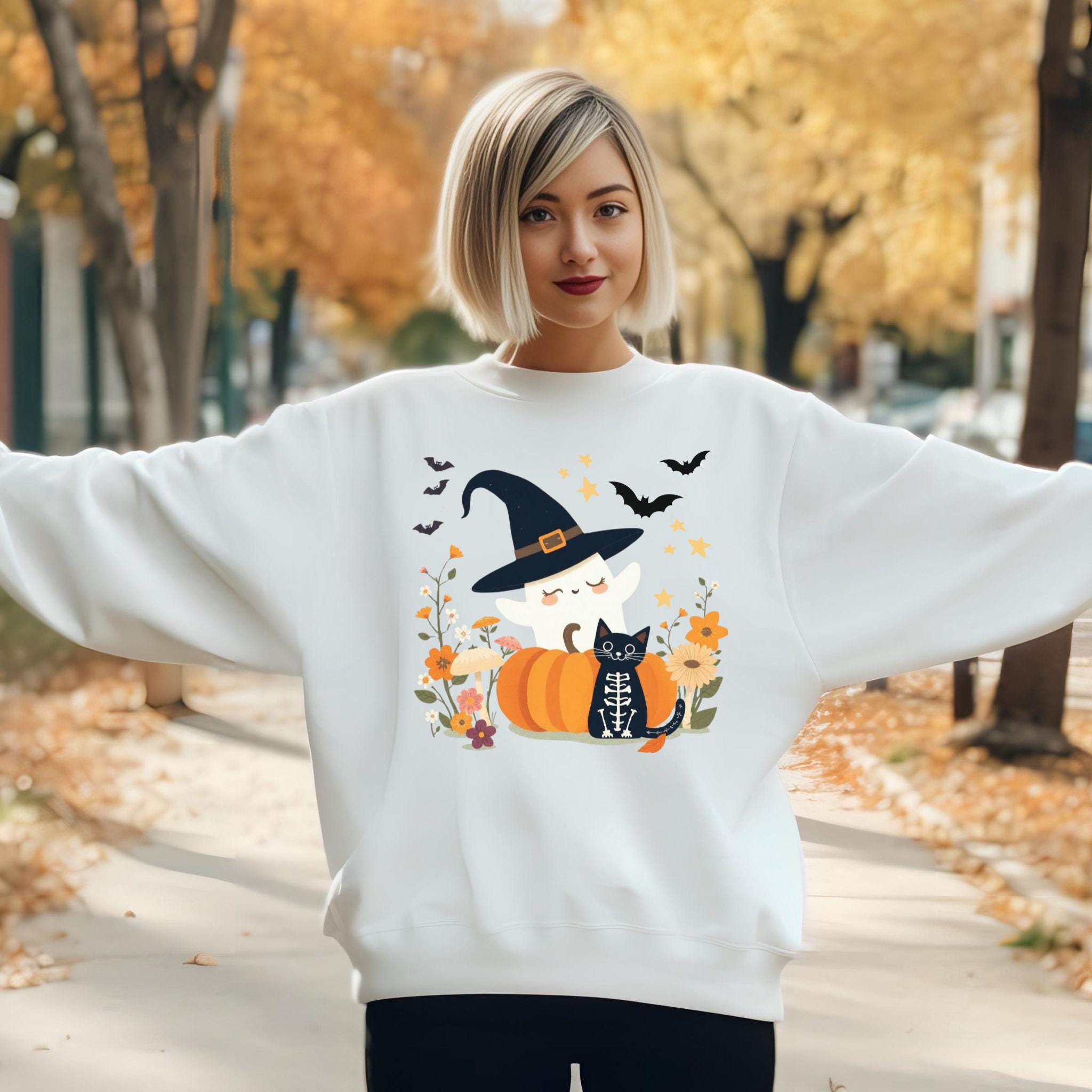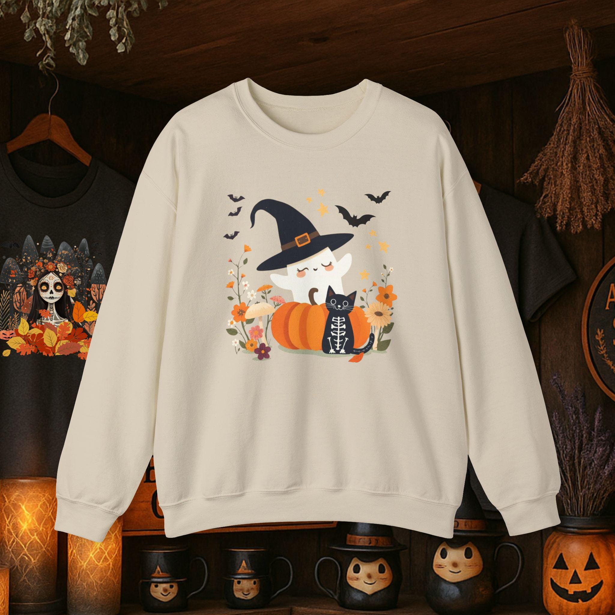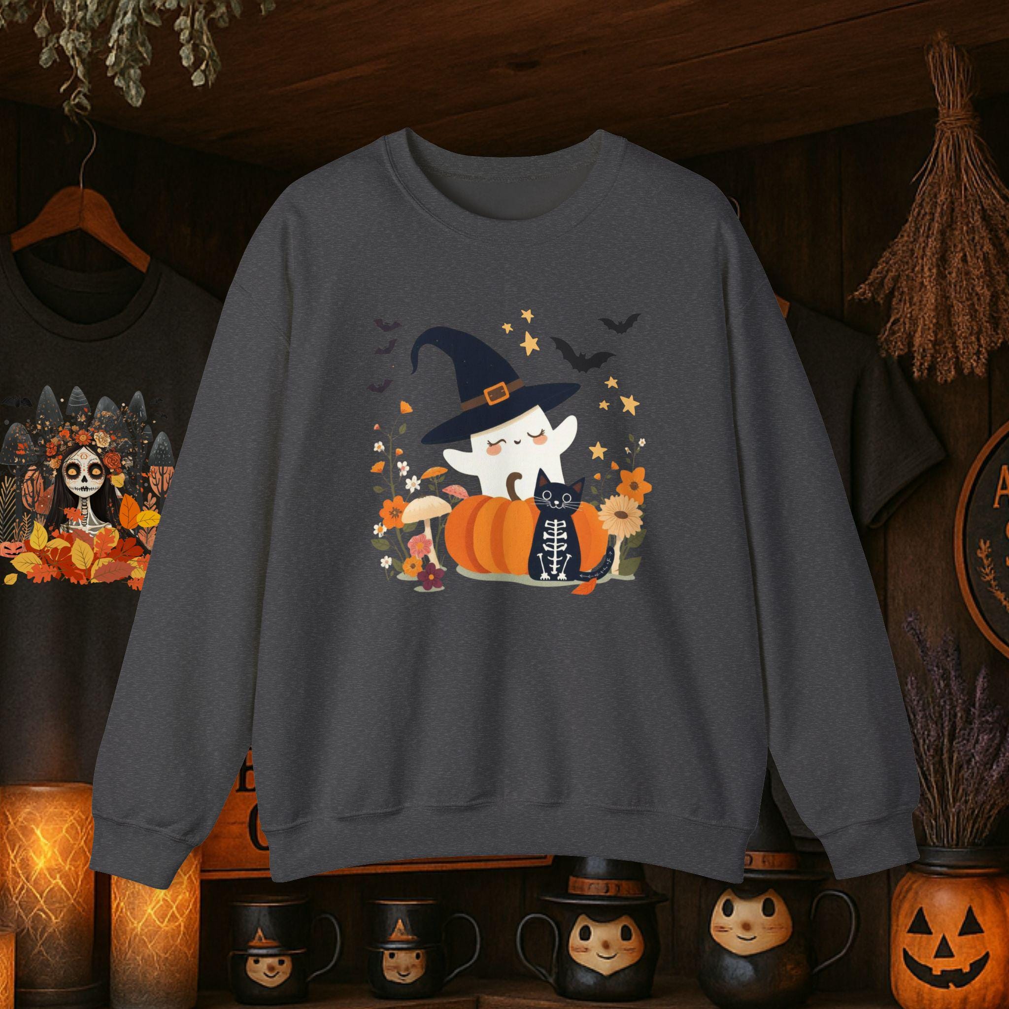 Wrap yourself in spooky sweetness this Halloween with our Ghost Witch Sweatshirt! 🧙♀️ Featuring a whimsical ghost in a witch hat cuddling a skeleton cat, surrounded by pumpkins, bats, and autumn flowers, this cozy crewneck is perfect for celebrating the season in comfort and style. 🎃🐾