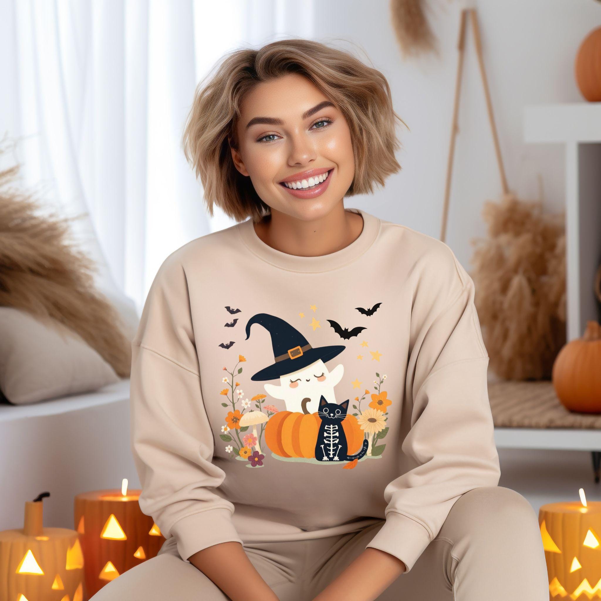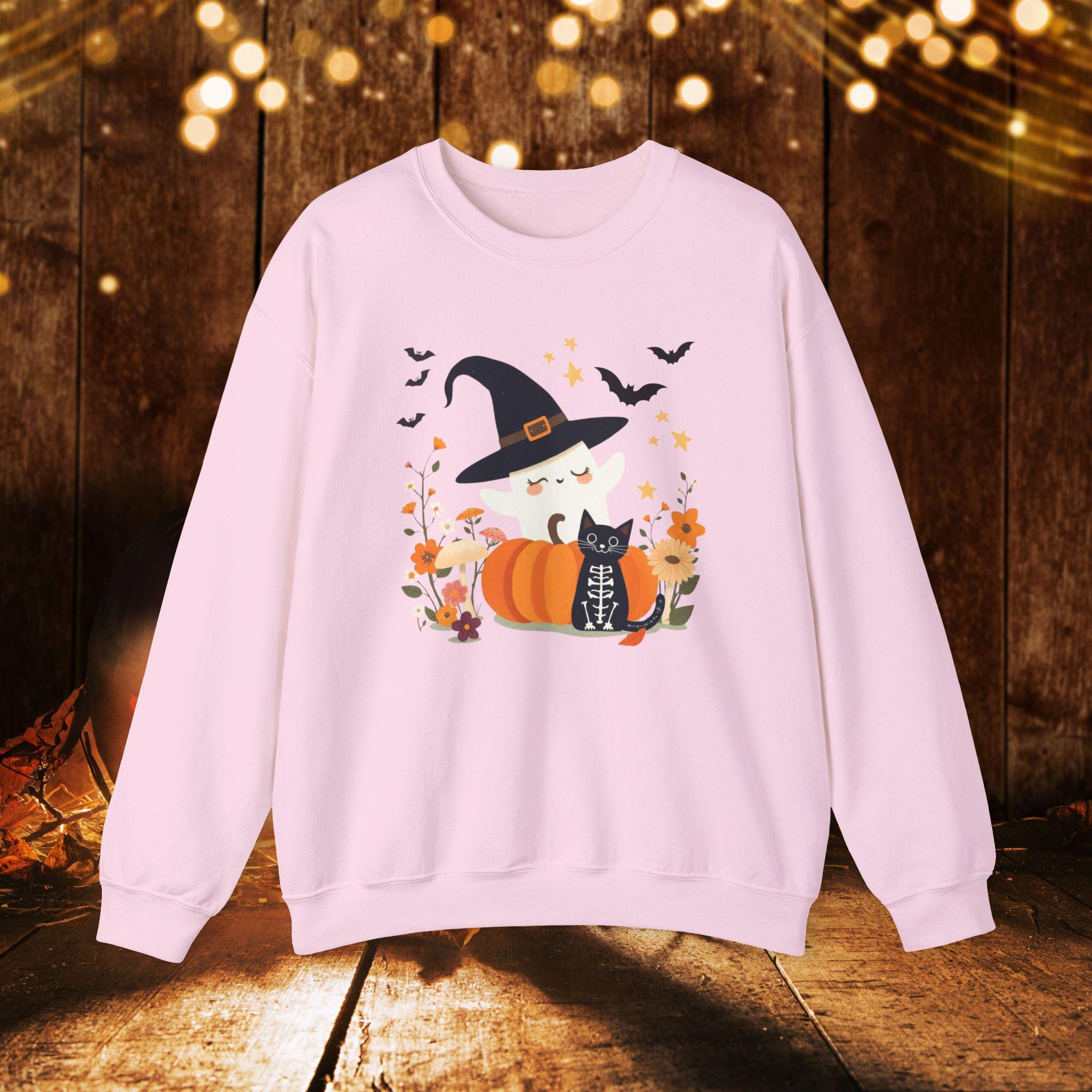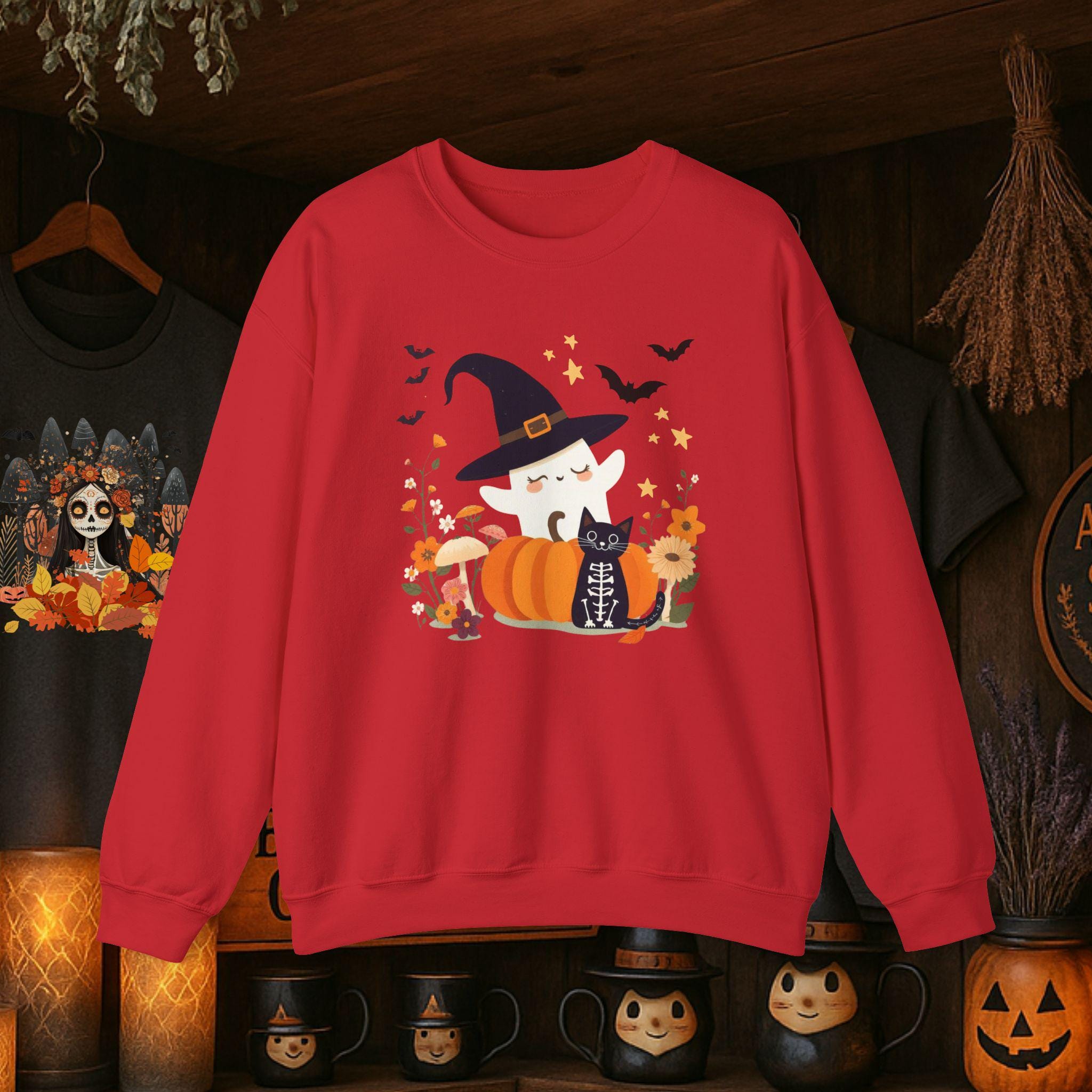Wrap yourself in spooky sweetness this Halloween with our Ghost Witch Sweatshirt! 🧙♀️ Featuring a whimsical ghost in a witch hat cuddling a skeleton cat, surrounded by pumpkins, bats, and autumn flowers, this cozy crewneck is perfect for celebrating the season in comfort and style. 🎃🐾