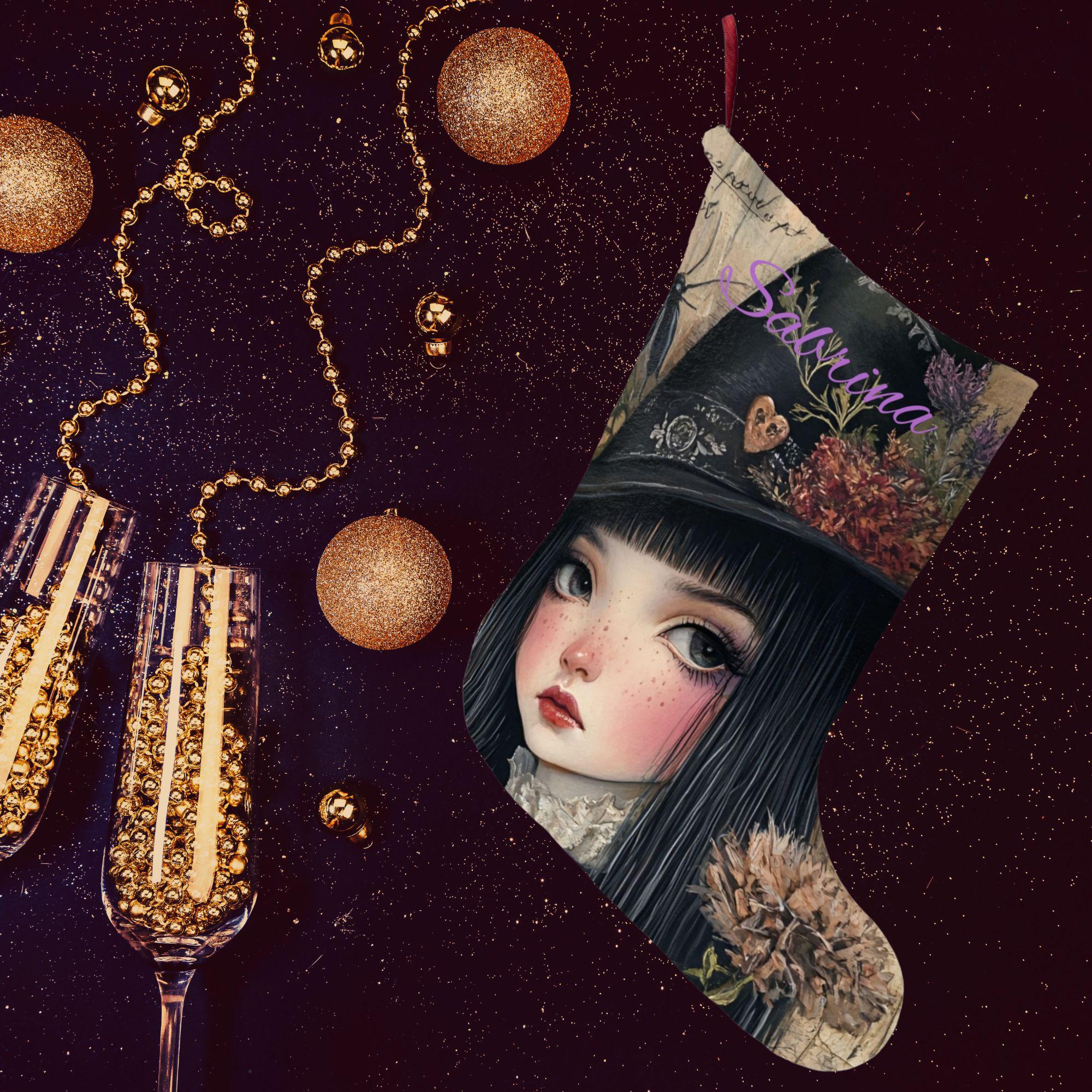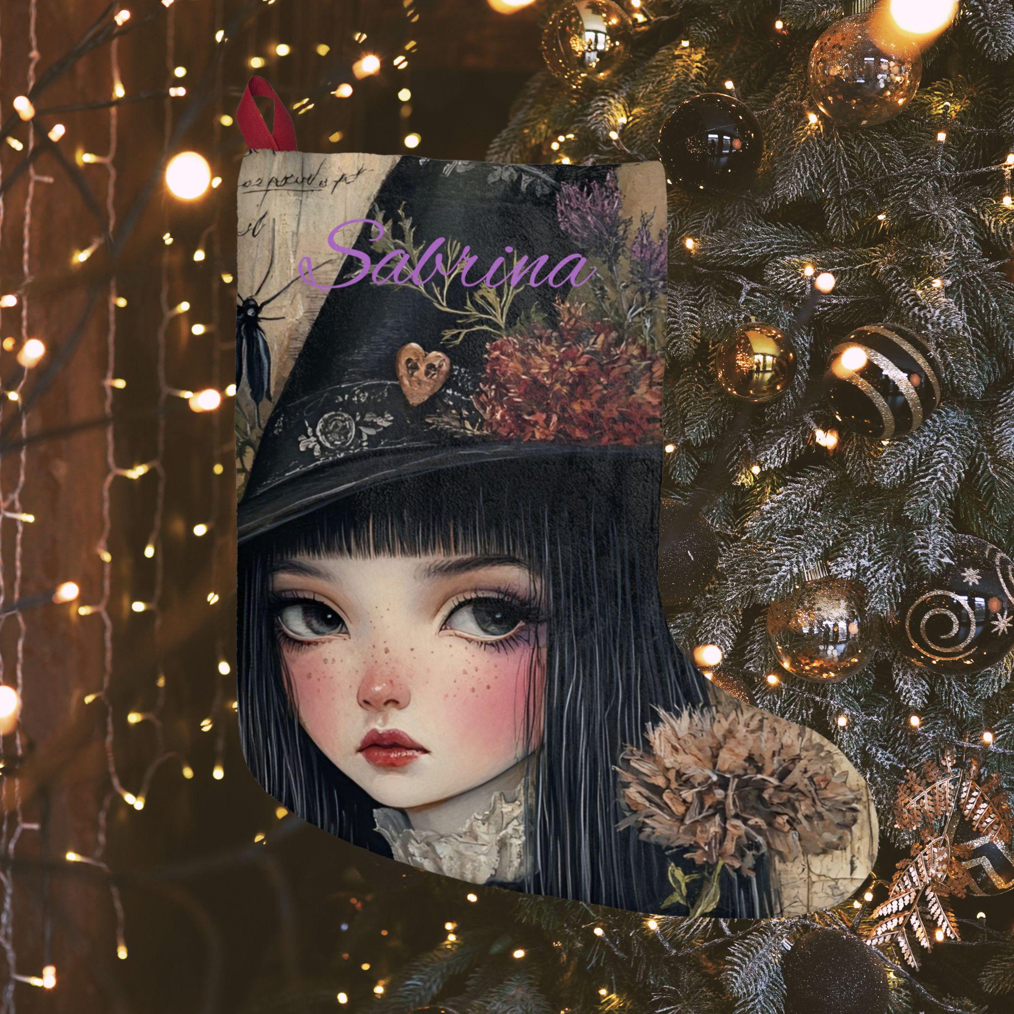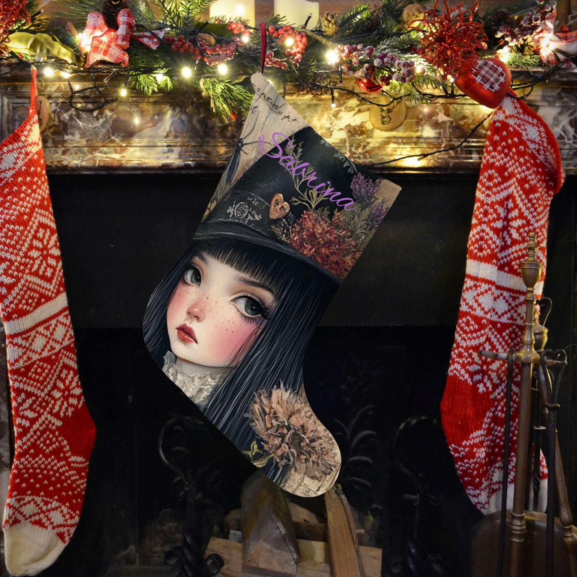 Bring a touch of magic to your holiday season with this personalized Christmas stocking. Featuring a stunning gothic-inspired girl illustration and your chosen name, this stocking is the perfect way to add an enchanting charm to your Christmas decor.
