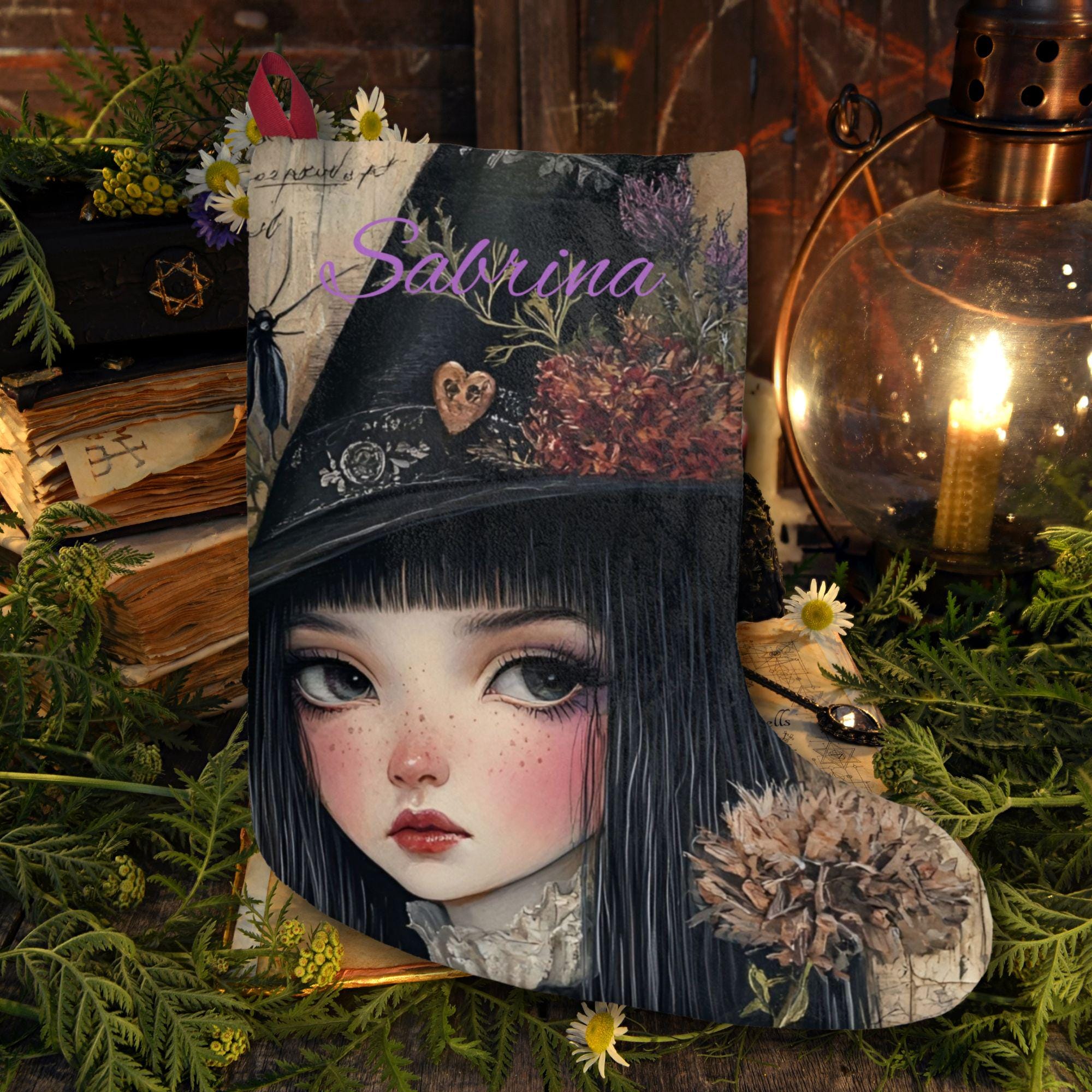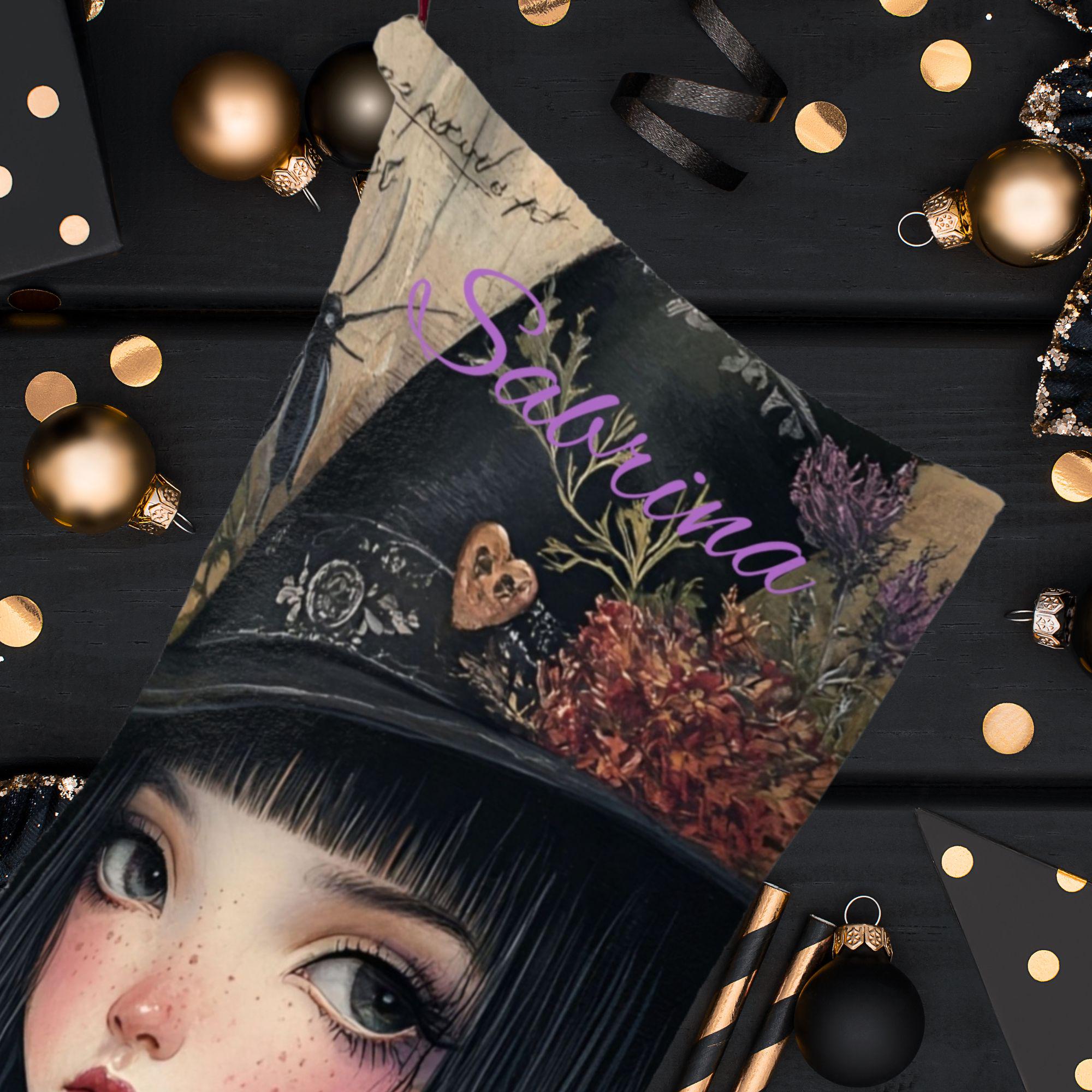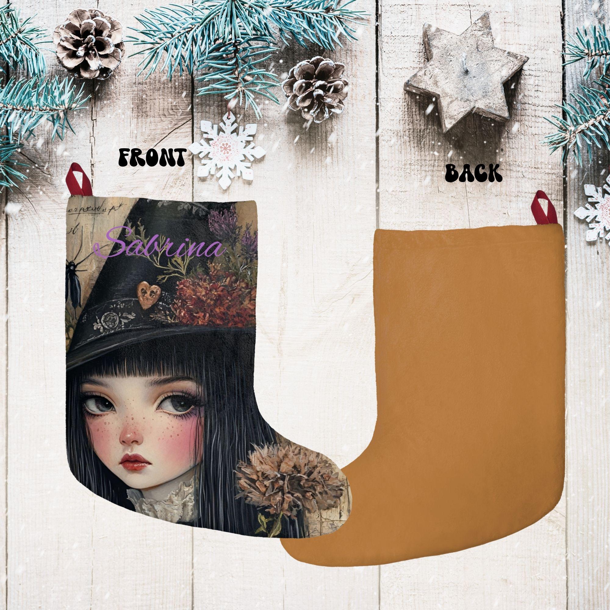 Bring a touch of magic to your holiday season with this personalized Christmas stocking. Featuring a stunning gothic-inspired girl illustration and your chosen name, this stocking is the perfect way to add an enchanting charm to your Christmas decor.