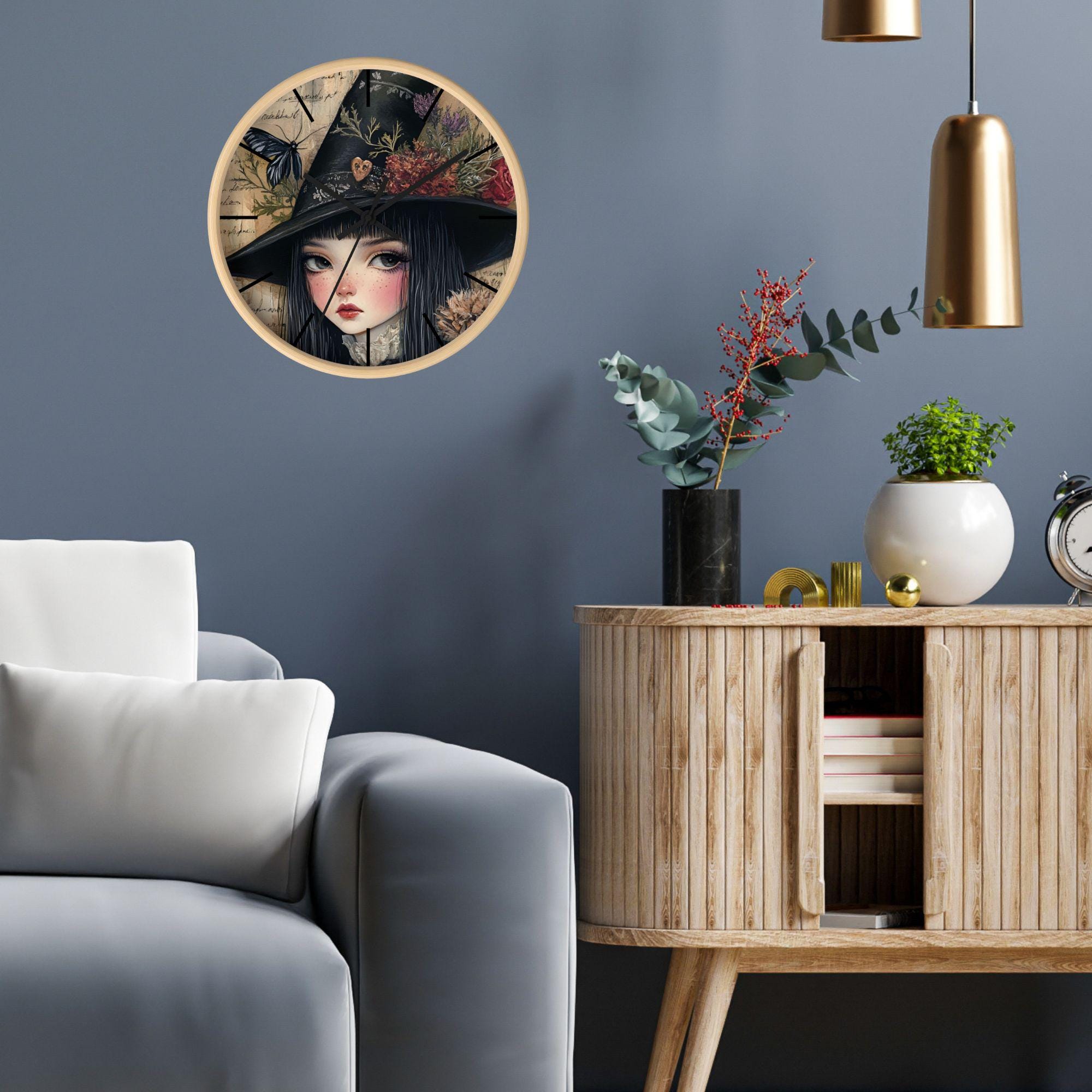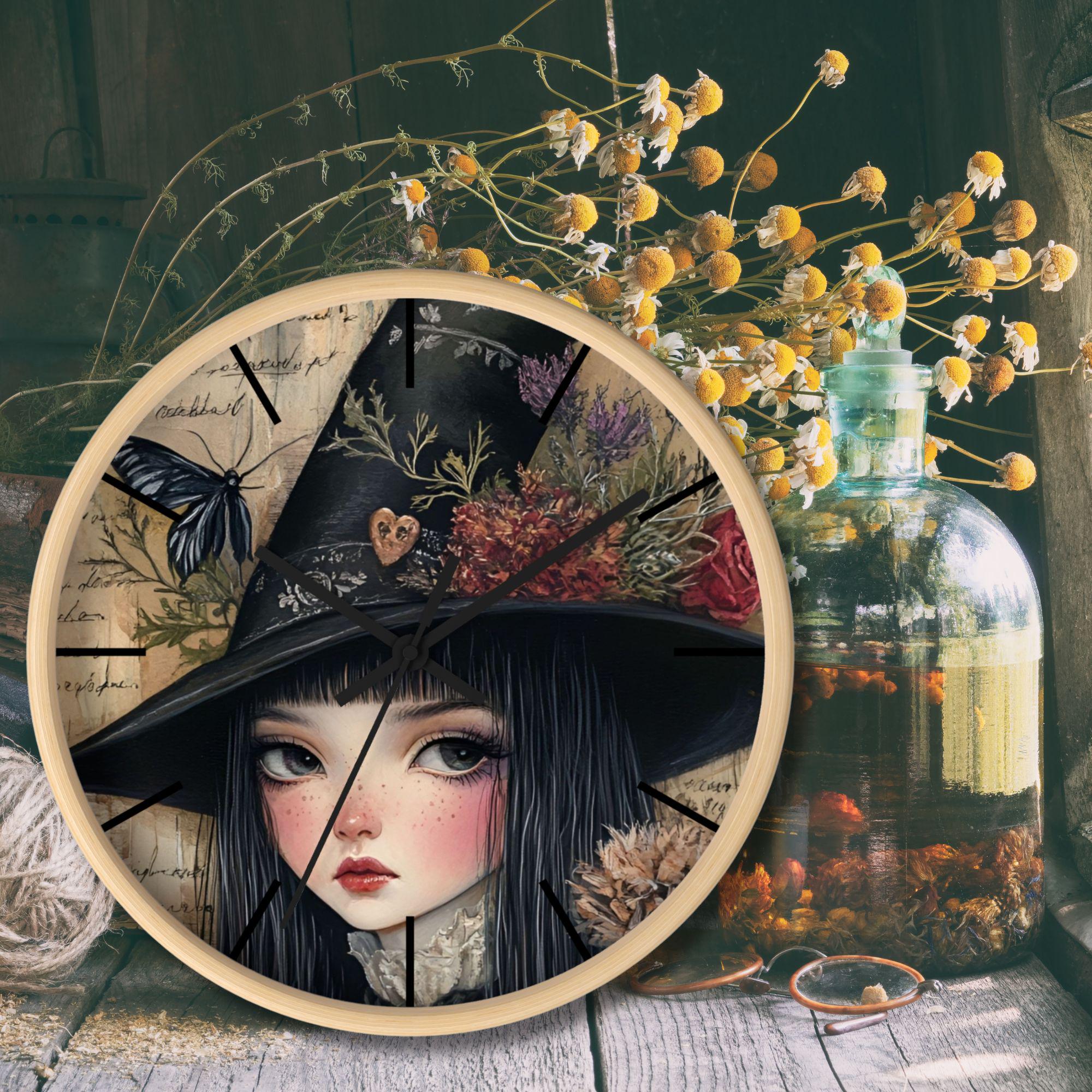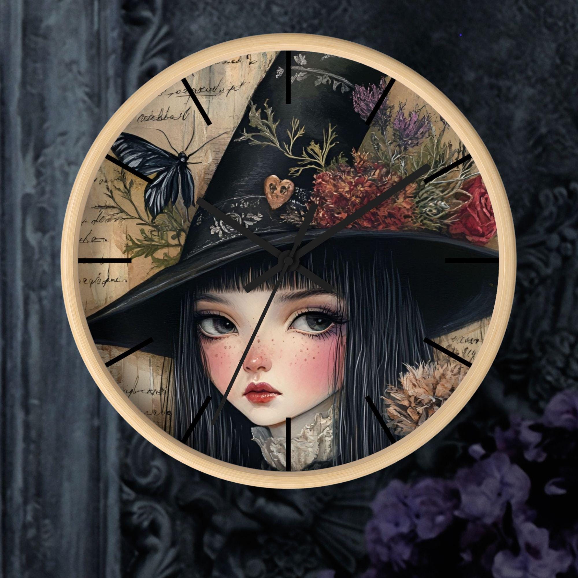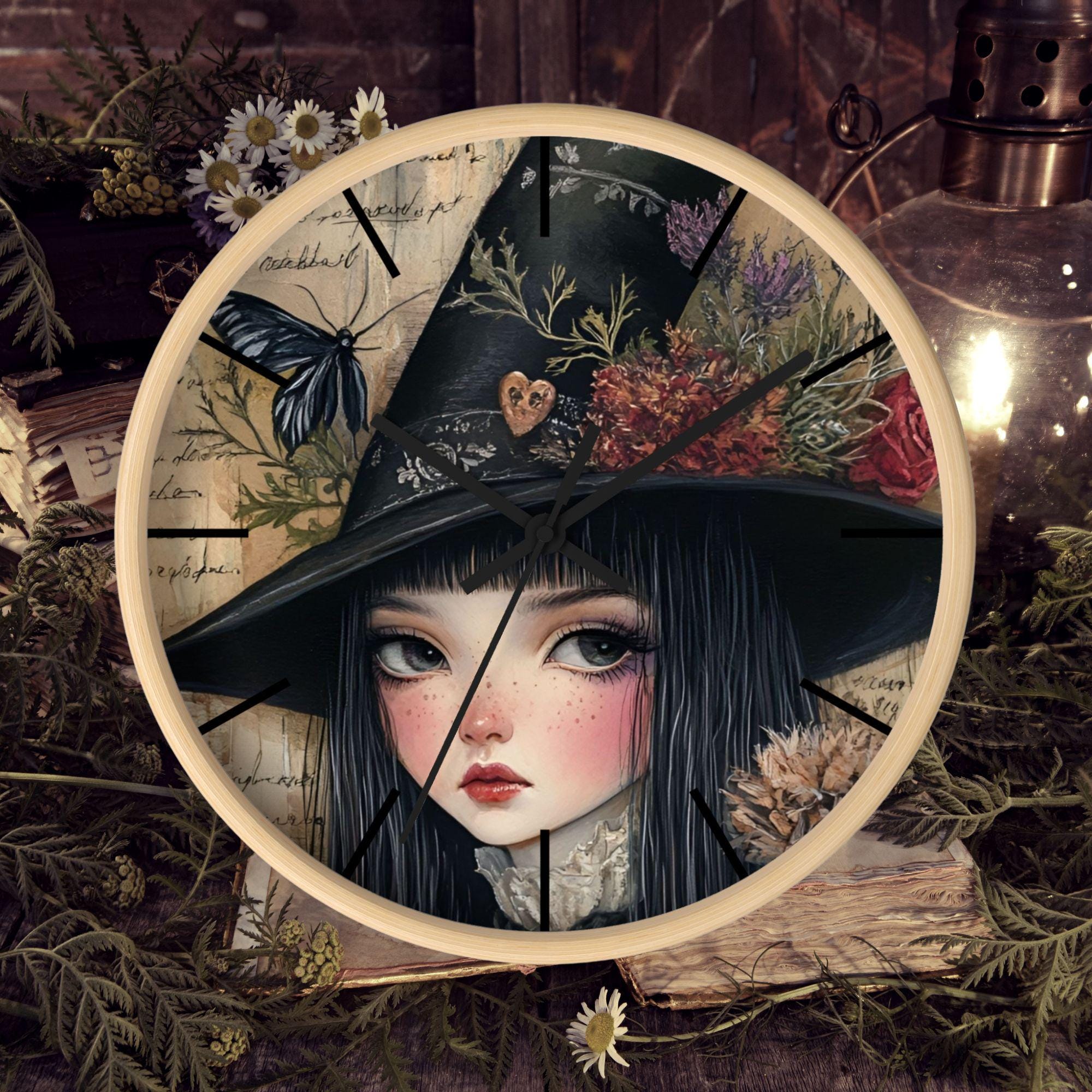 Bring a touch of enchantment to your space with this beautifully illustrated wall clock featuring a dreamy witch adorned with flowers and a black butterfly. Perfect for those who love witchcore, fairycore, and vintage aesthetics, this piece combines art and functionality to create a timeless accent for your home.