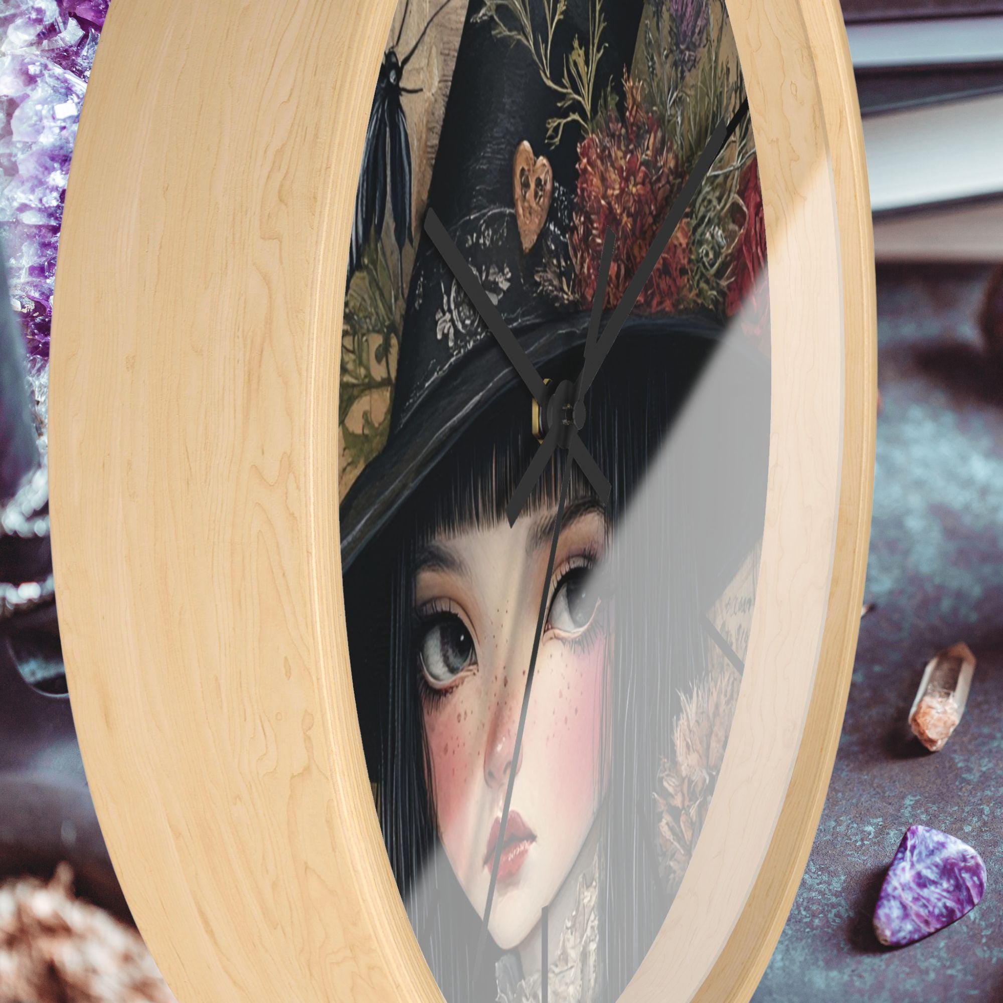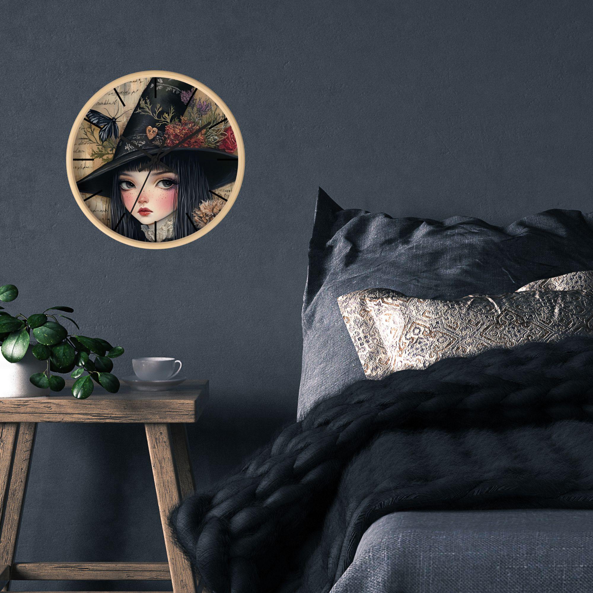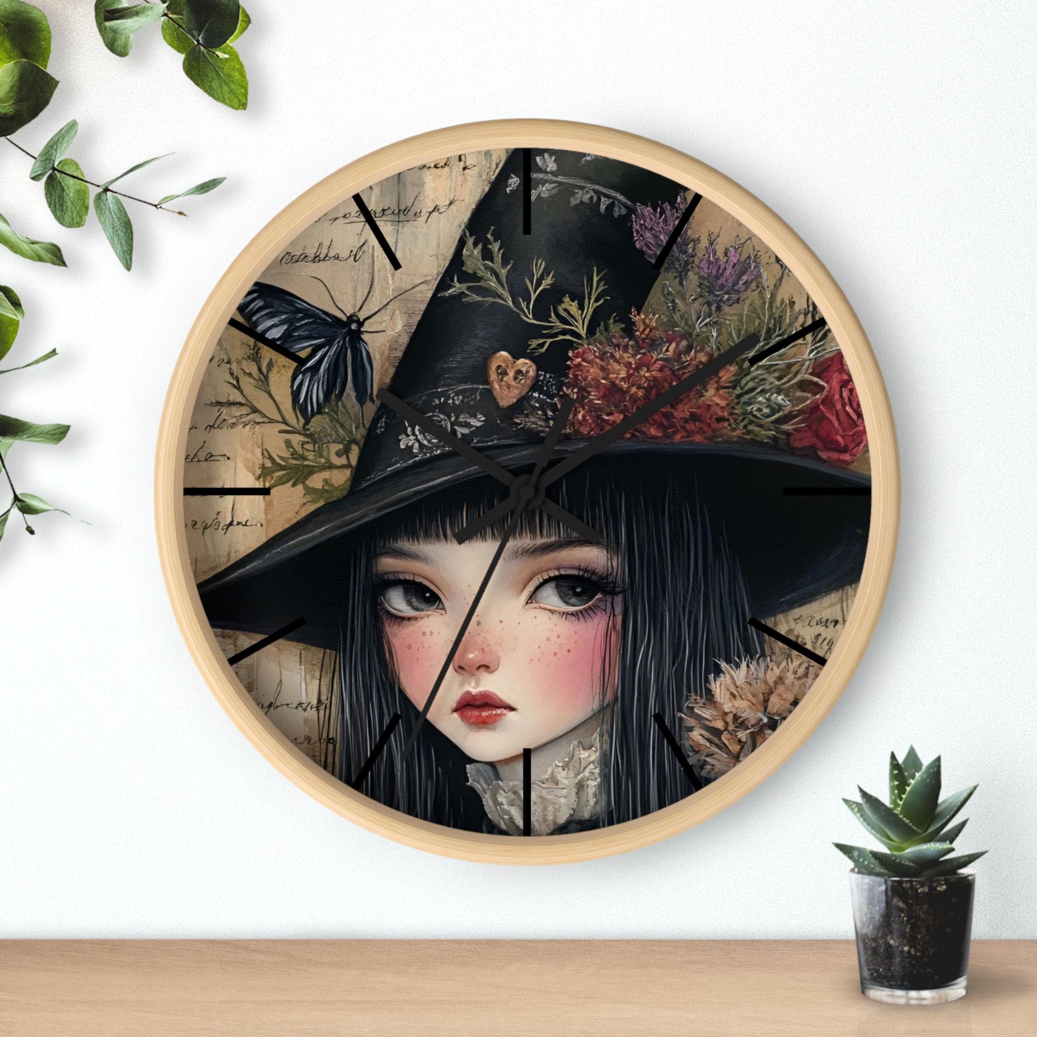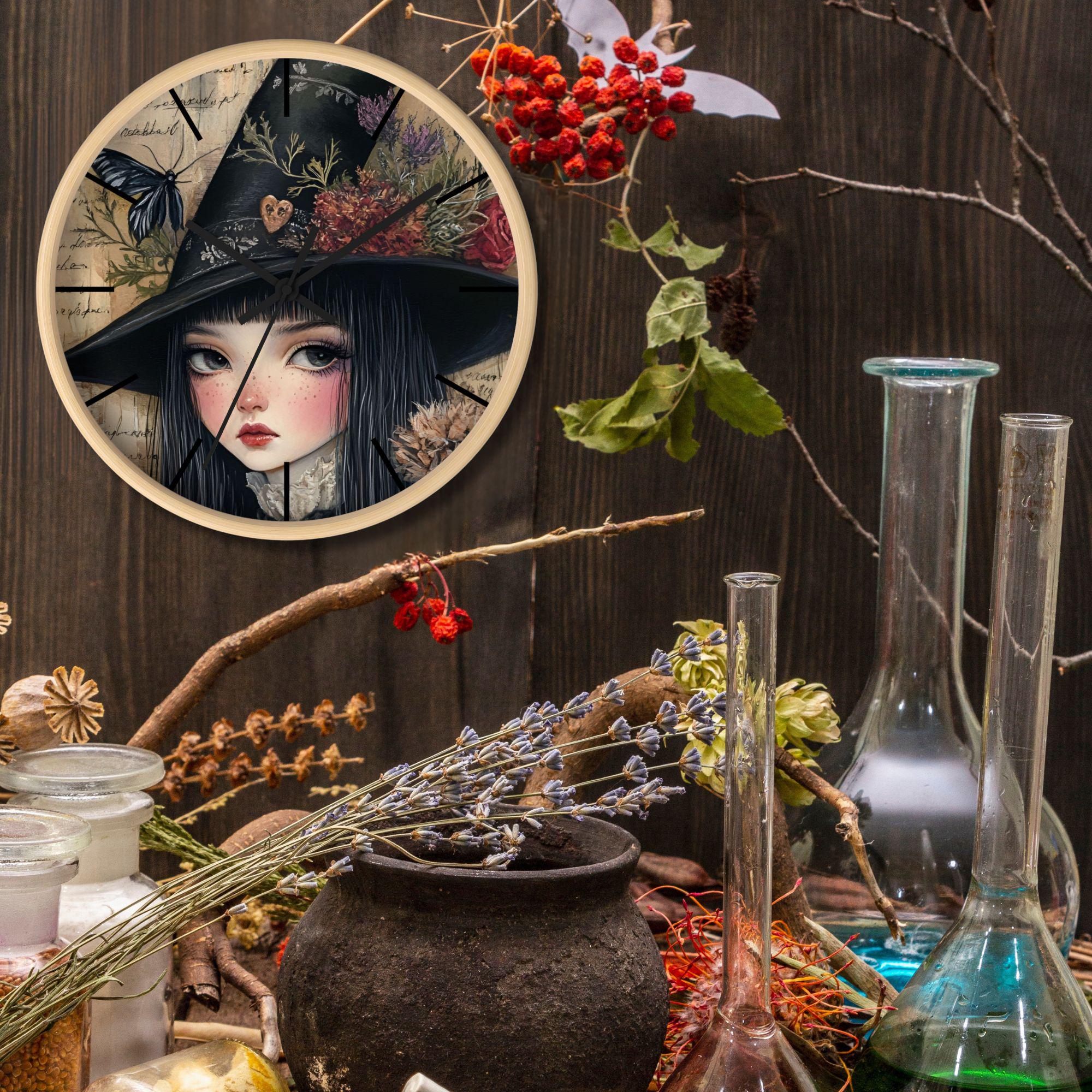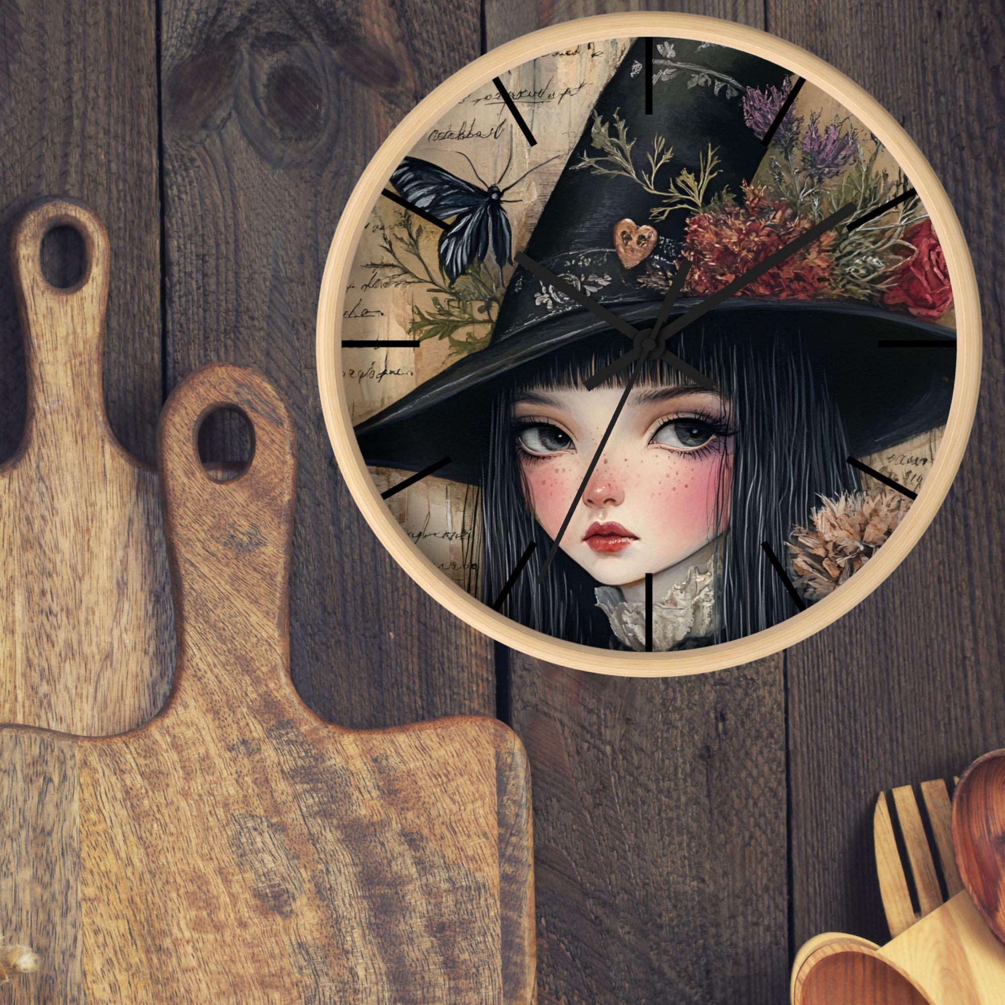 Bring a touch of enchantment to your space with this beautifully illustrated wall clock featuring a dreamy witch adorned with flowers and a black butterfly. Perfect for those who love witchcore, fairycore, and vintage aesthetics, this piece combines art and functionality to create a timeless accent for your home.