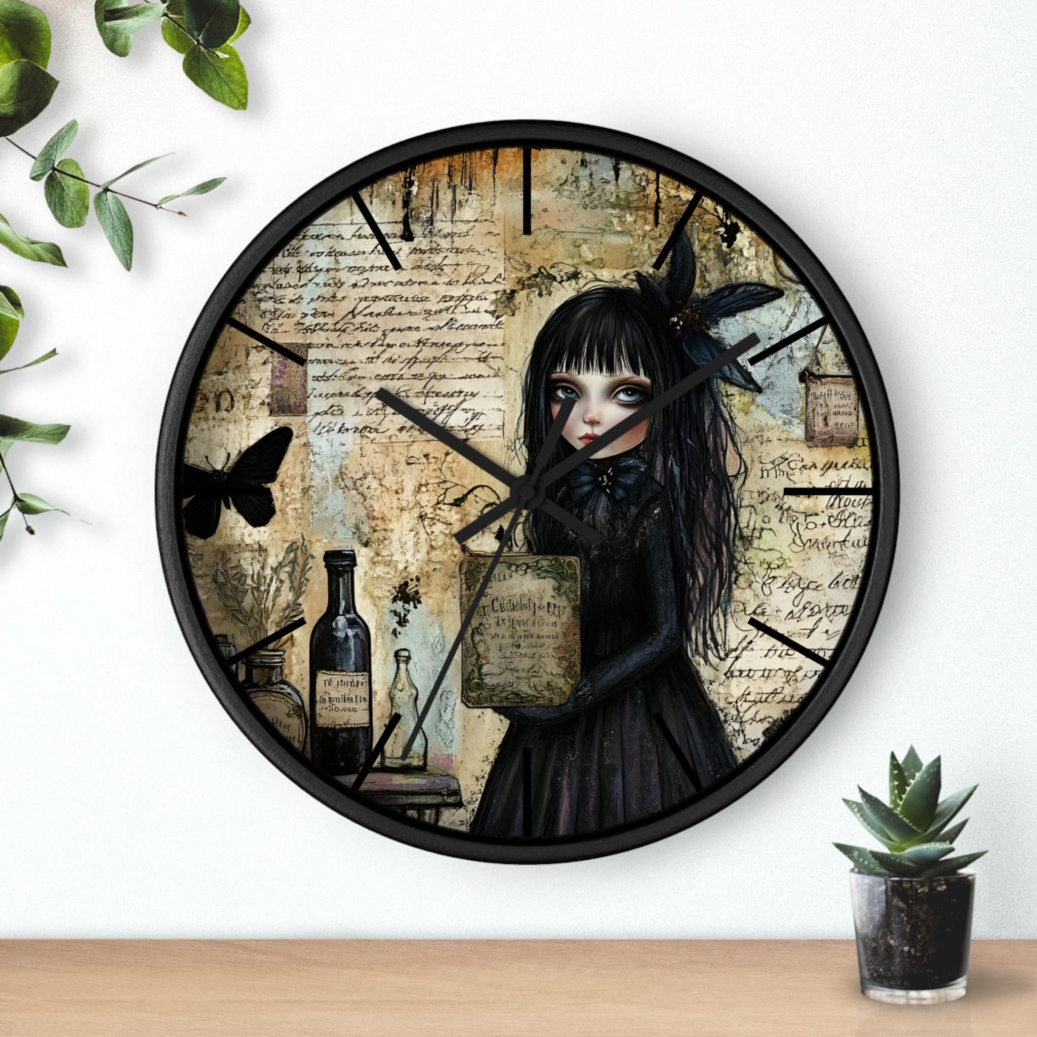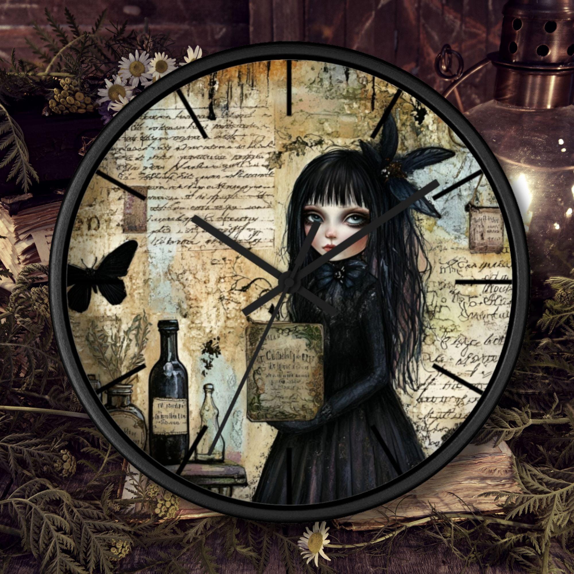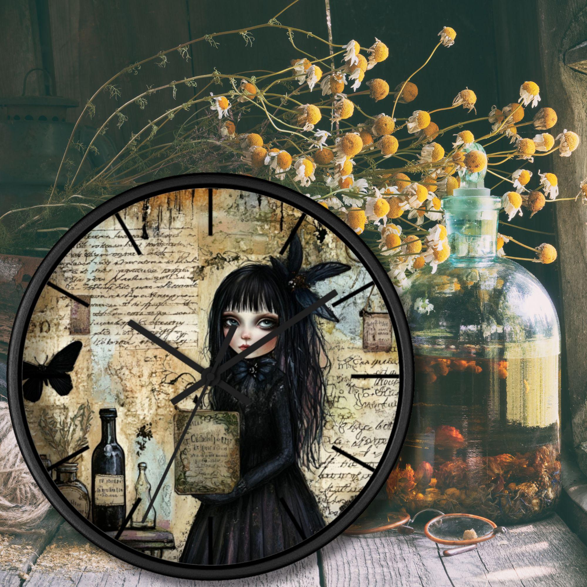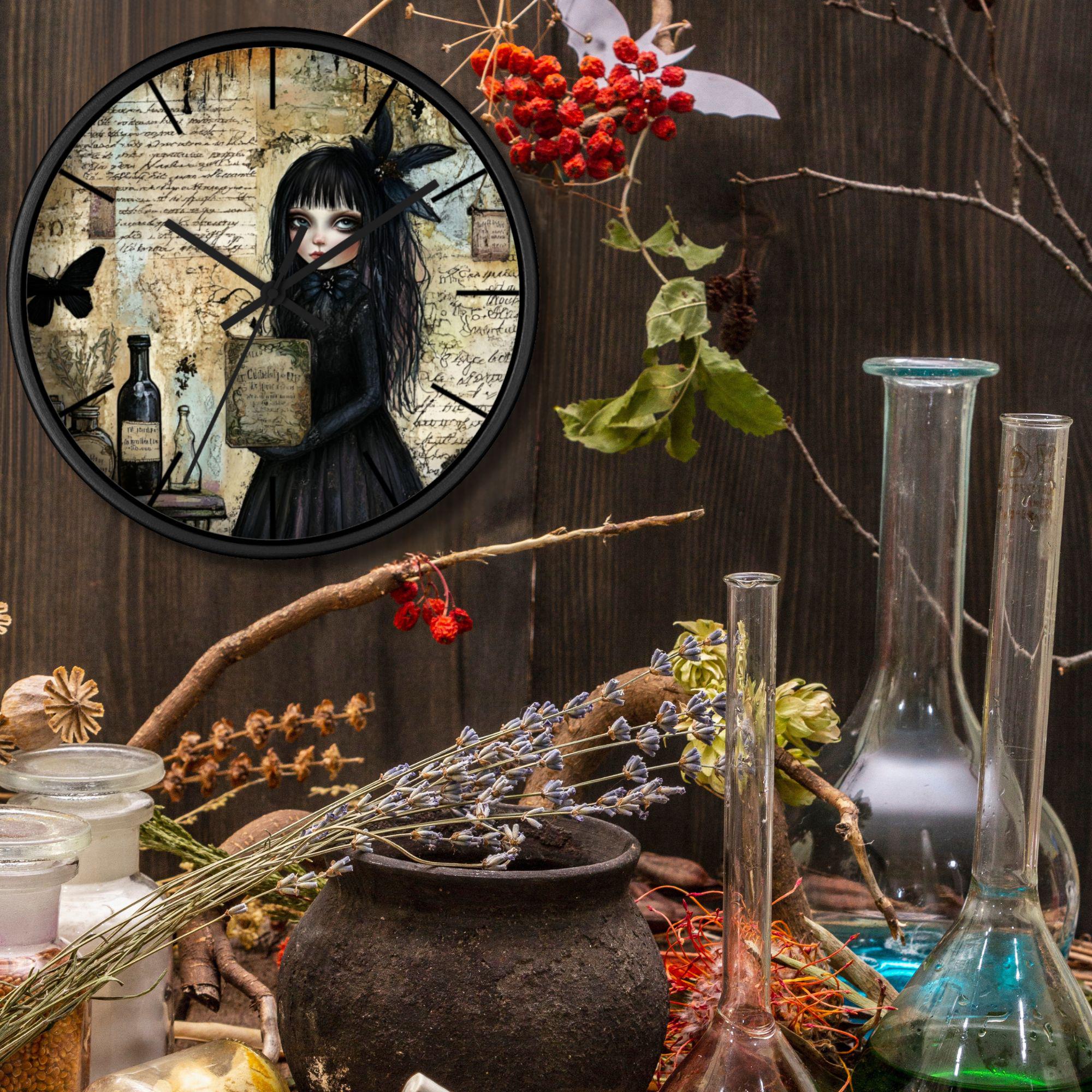 Embrace your love for all things magical and mysterious with this Gothic Witch Apothecary Wall Clock. Featuring a hauntingly beautiful dark-haired witch holding a spellbook among vintage potion bottles, this piece blends dark academia, witchcore, and old-world apothecary charm into one captivating design. Perfect for cozy nooks, reading corners, and witchy home décor.