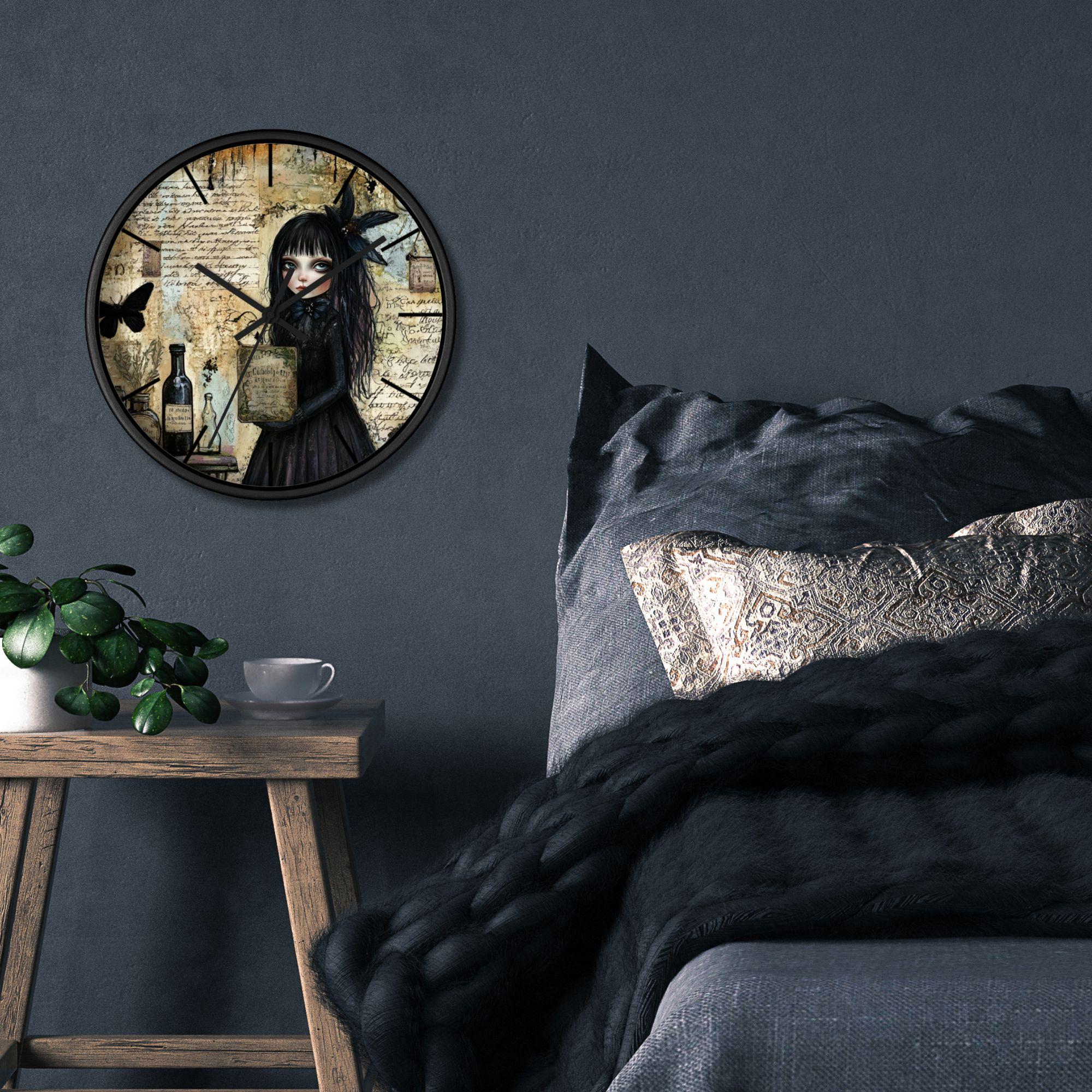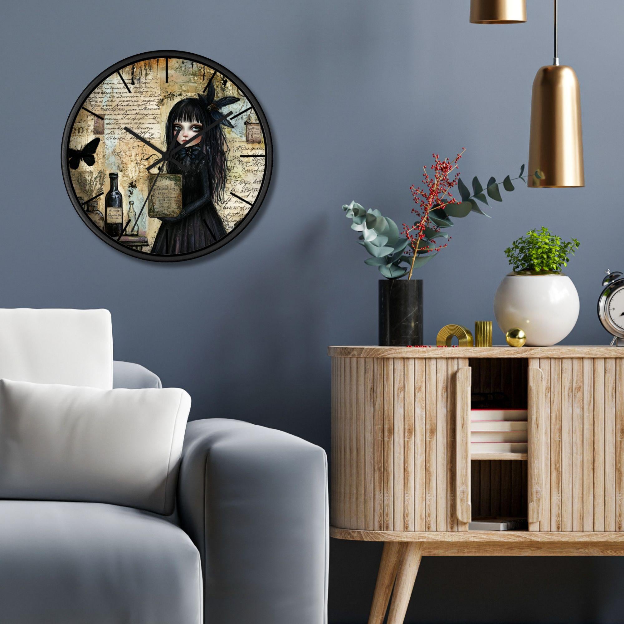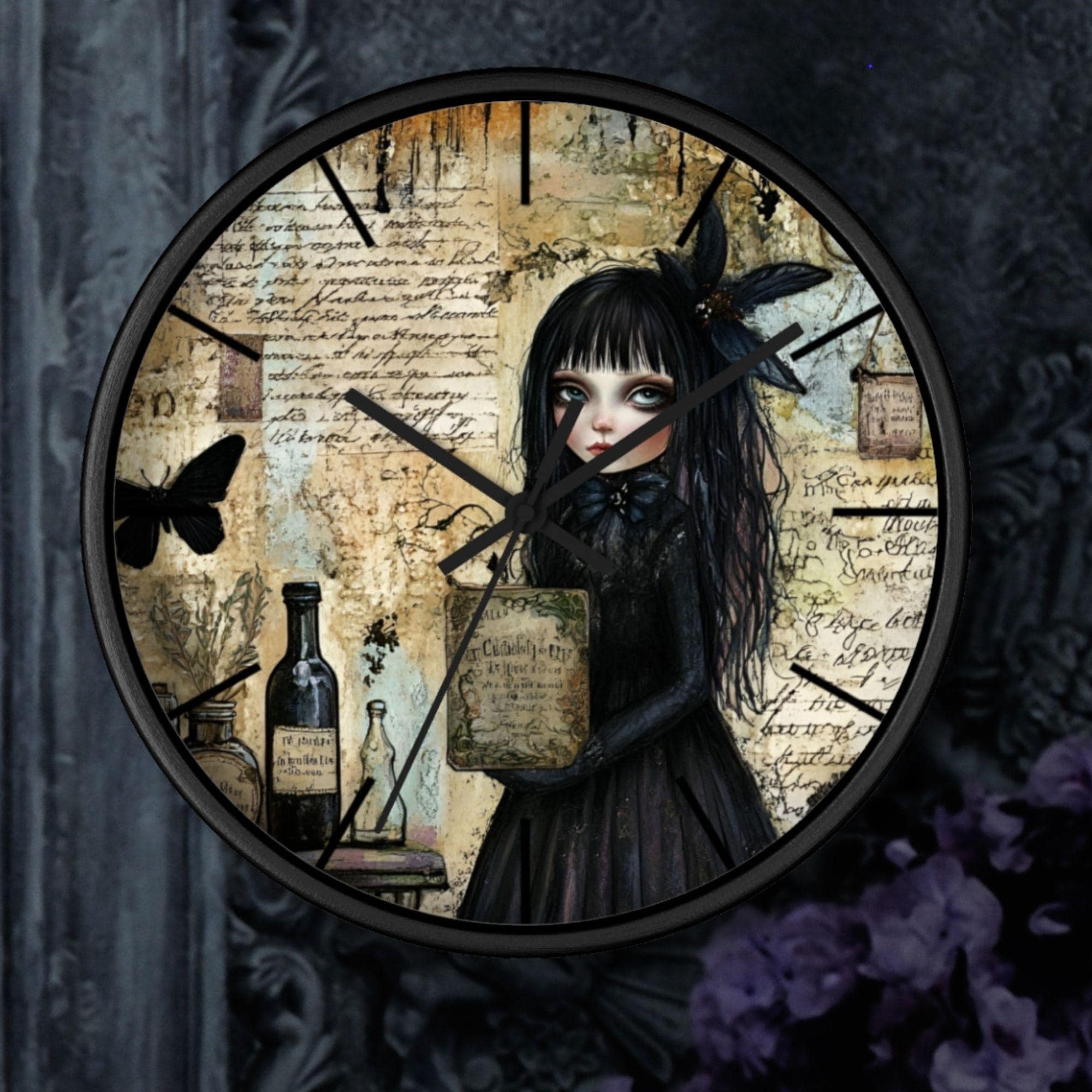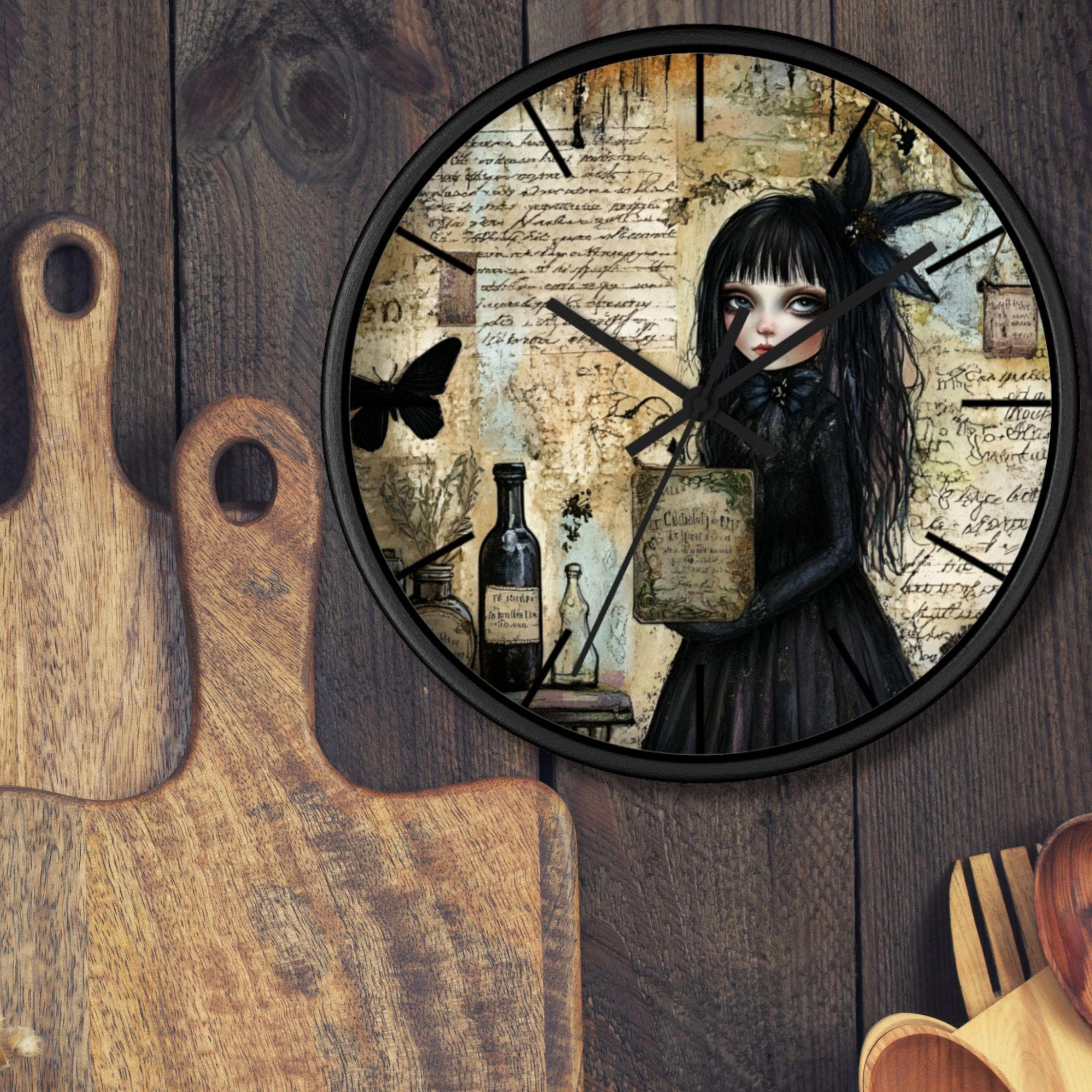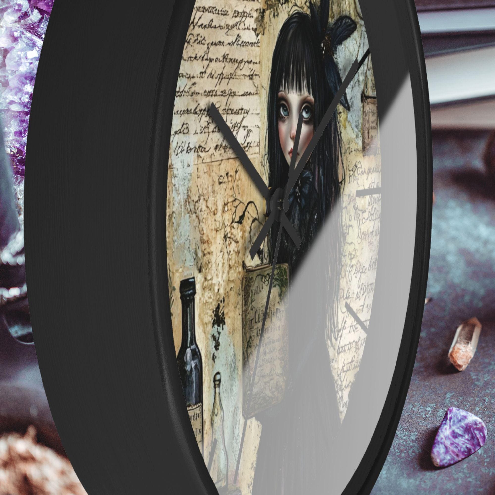 Embrace your love for all things magical and mysterious with this Gothic Witch Apothecary Wall Clock. Featuring a hauntingly beautiful dark-haired witch holding a spellbook among vintage potion bottles, this piece blends dark academia, witchcore, and old-world apothecary charm into one captivating design. Perfect for cozy nooks, reading corners, and witchy home décor.