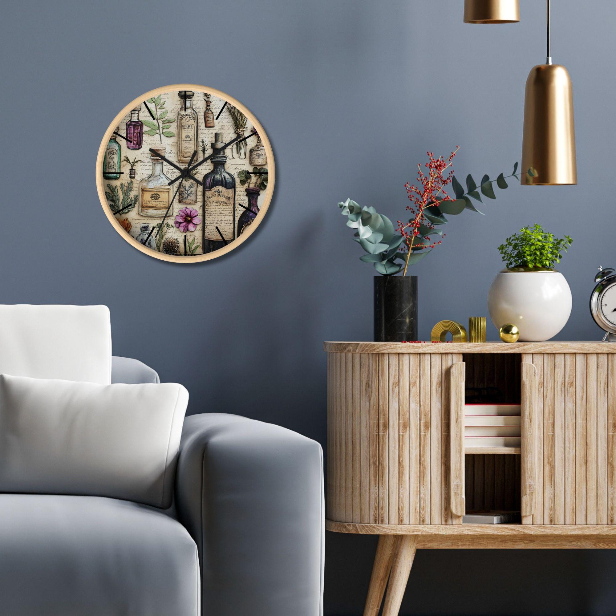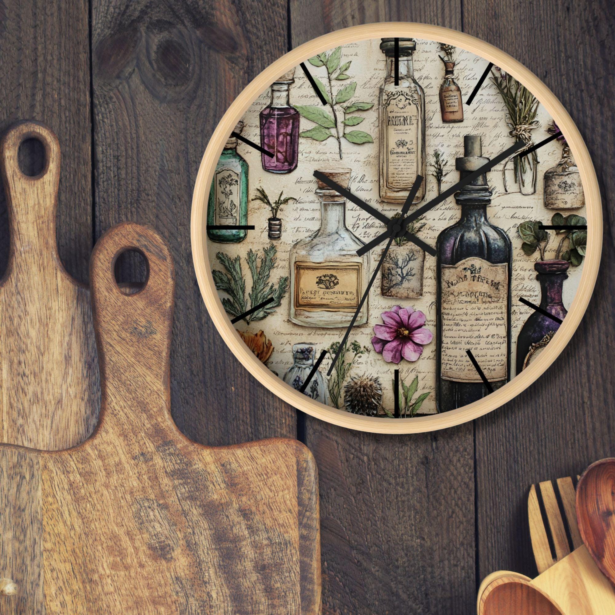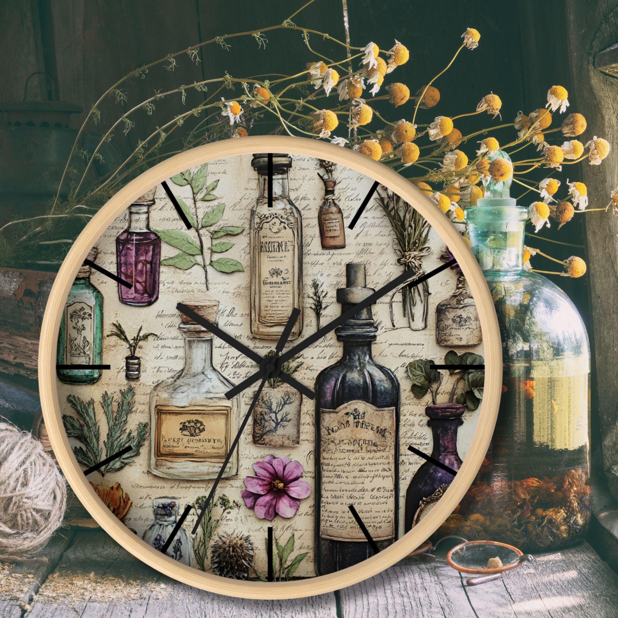 Bring the charm of an old-world apothecary into your home with this Botanical Apothecary Wall Clock. Featuring beautifully detailed vintage potion bottles, herbs, and pressed florals set against aged parchment and handwritten botanical notes, this piece blends art and timekeeping in the most magical way. Perfect for herbal witches, cottage dwellers, and nature lovers alike.