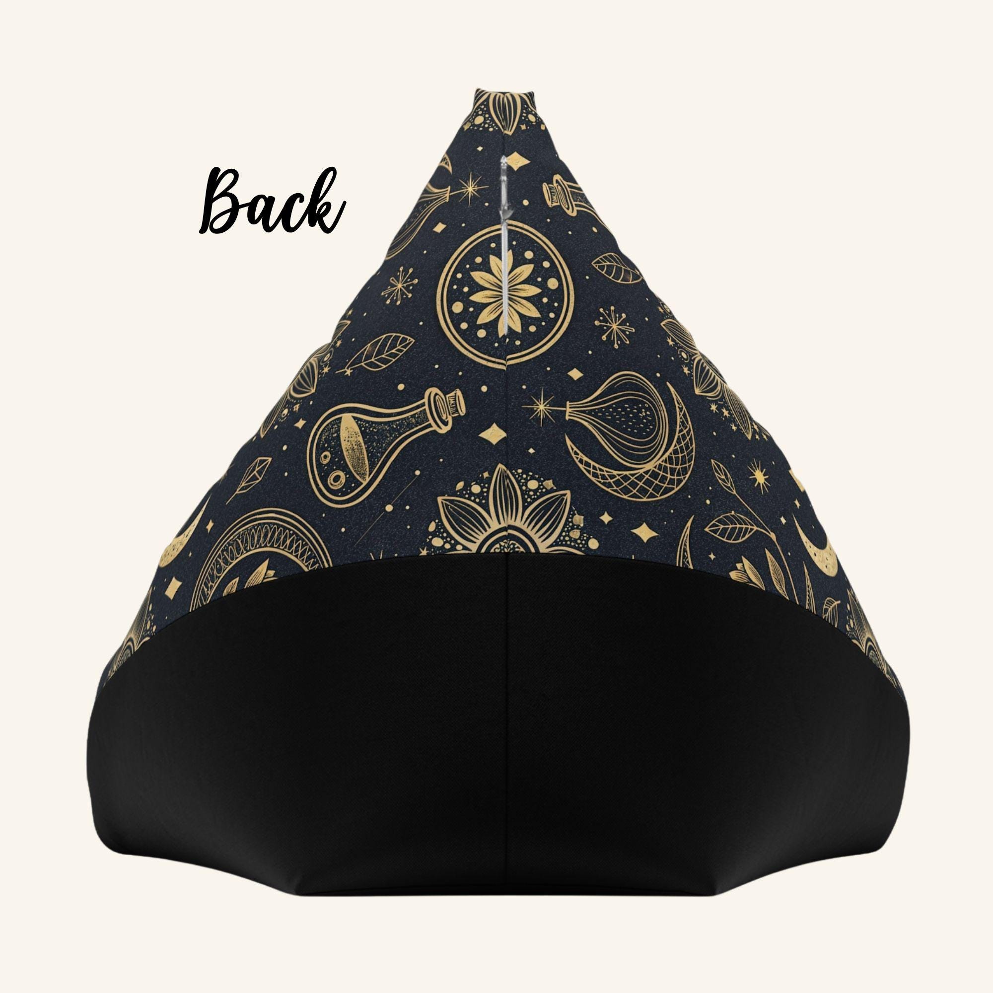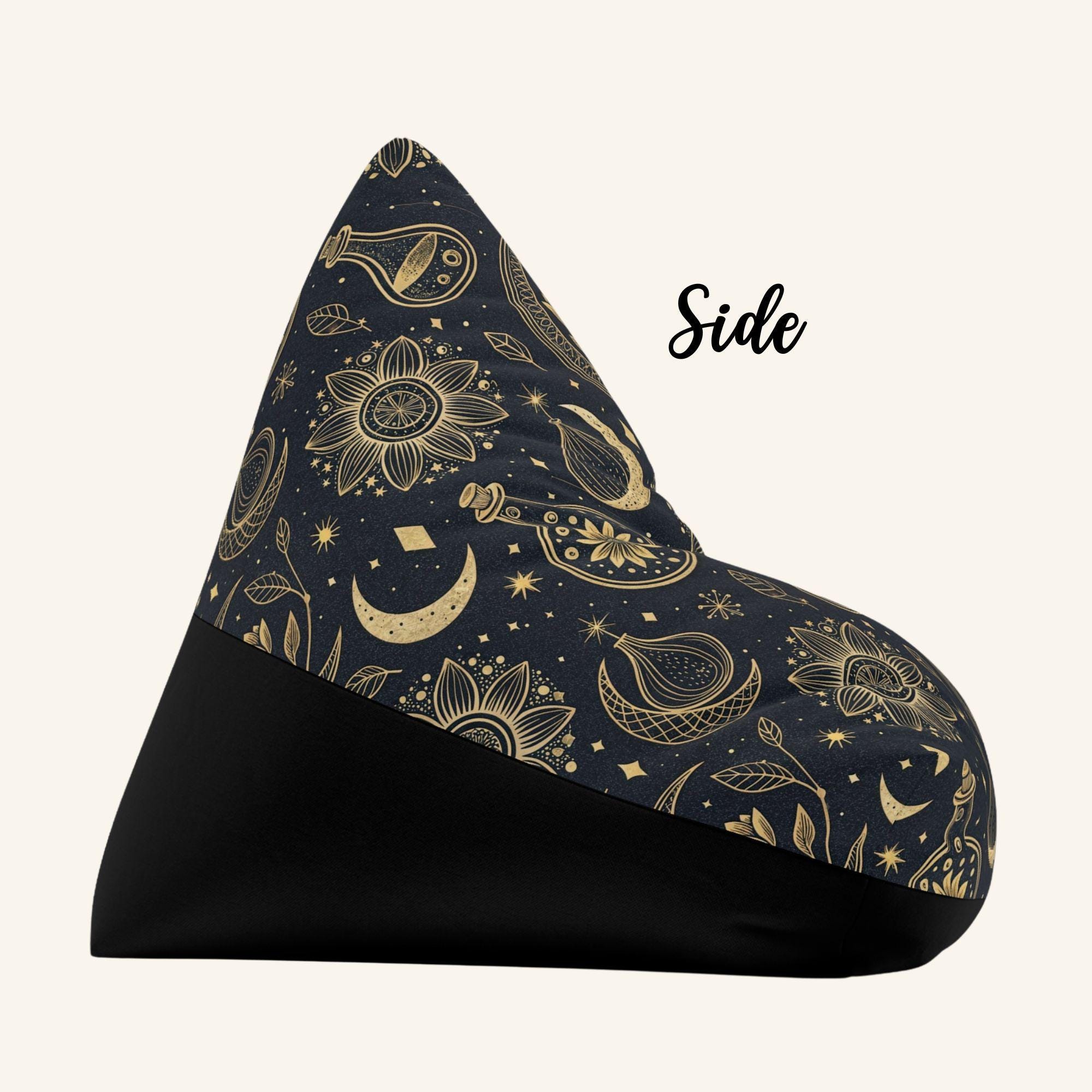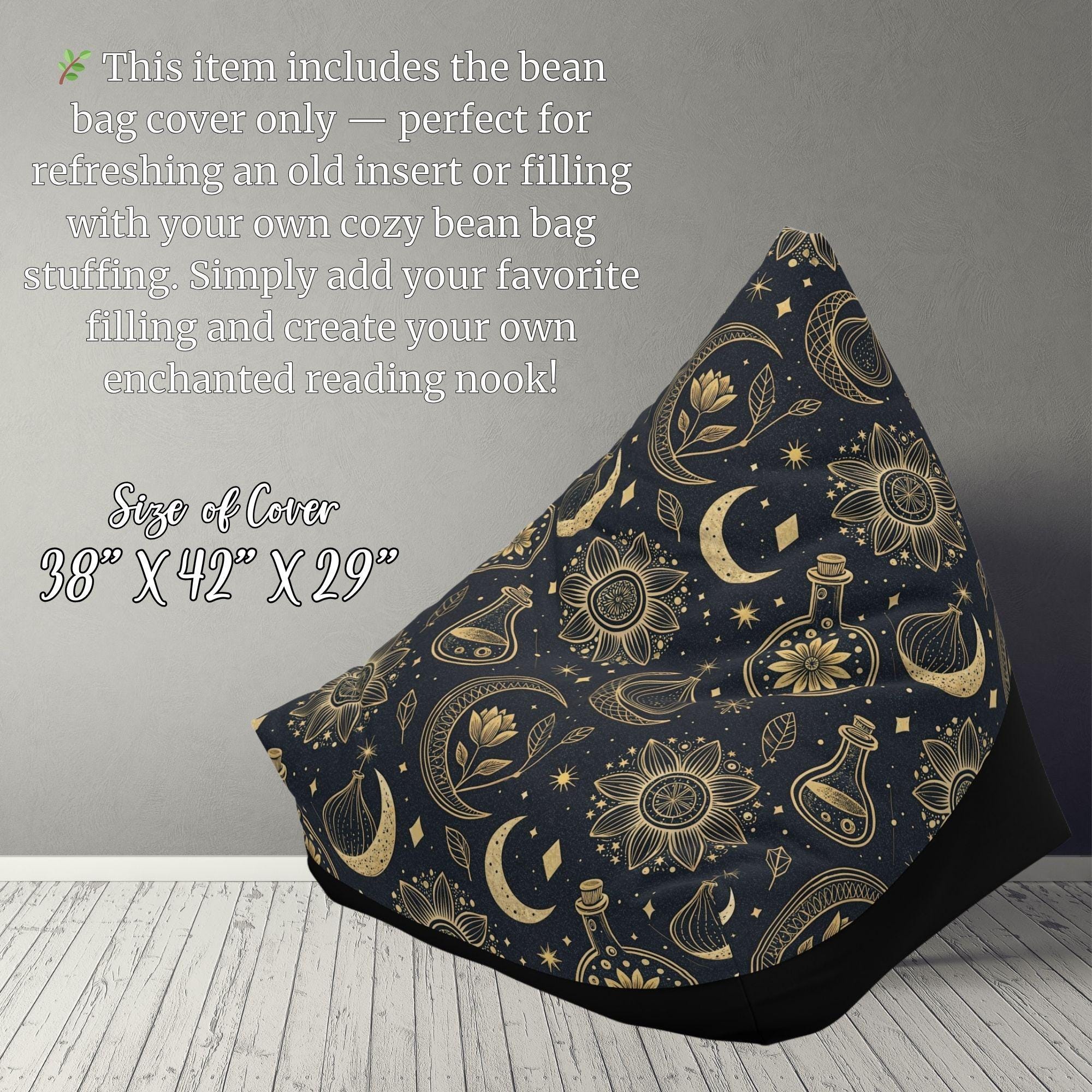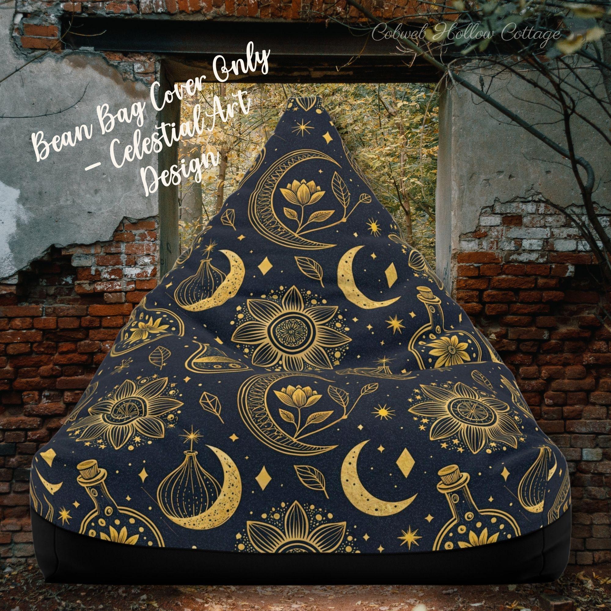 Add a touch of cosmic charm to your cozy corner with this Celestial Witch Bean Bag Cover — where starlit skies meet witchy elegance. Featuring golden moons, potion bottles, flowers, and celestial symbols against a deep black background, this design transforms any room into a space of mystic serenity.