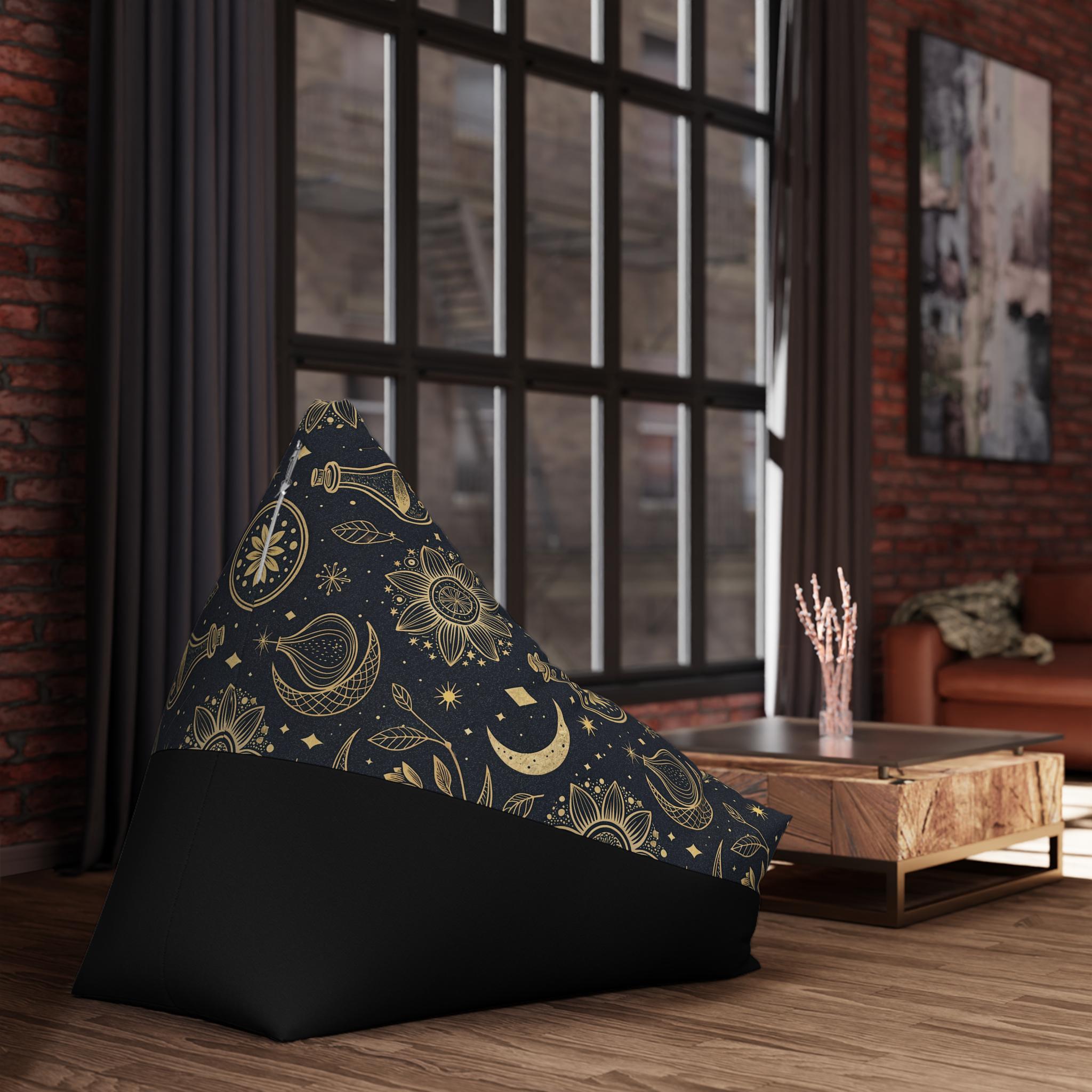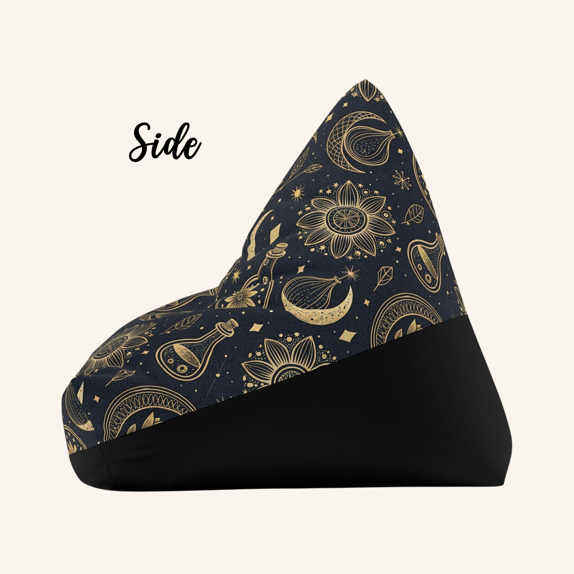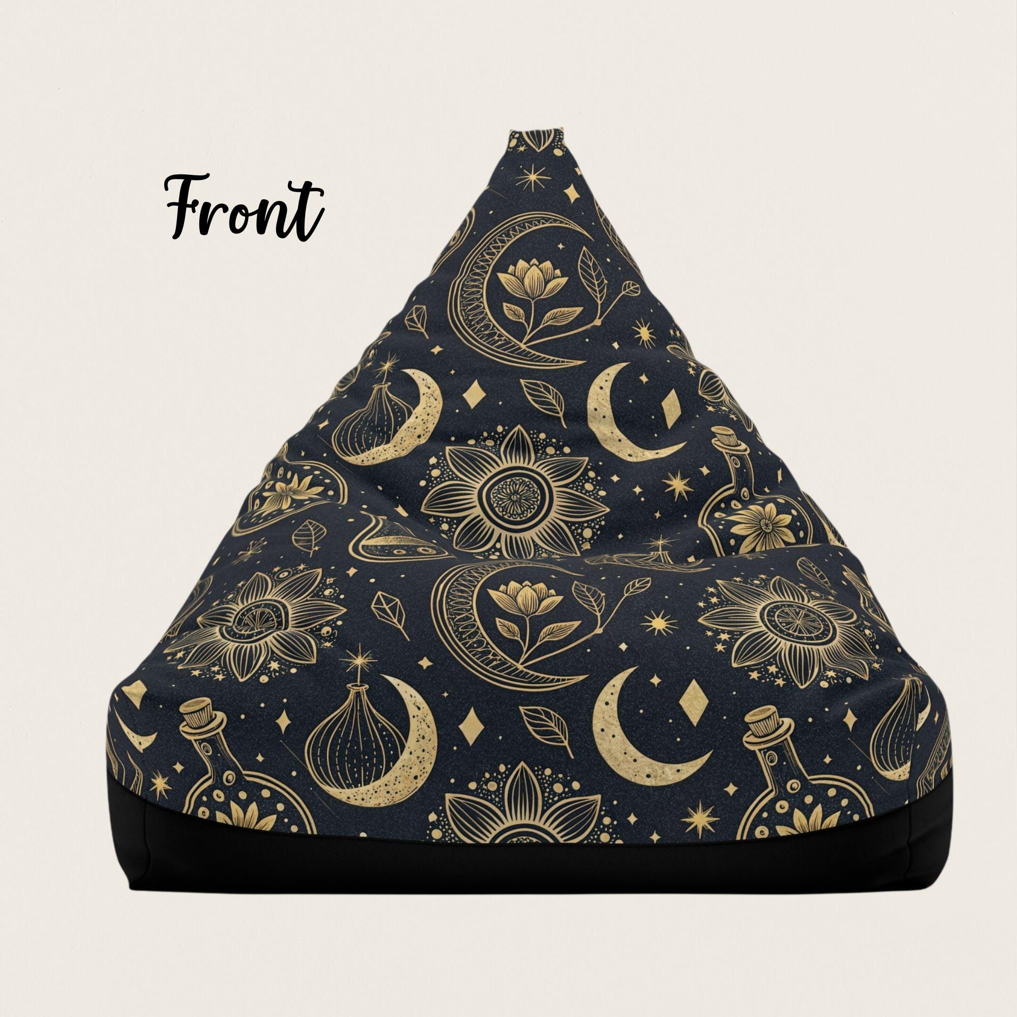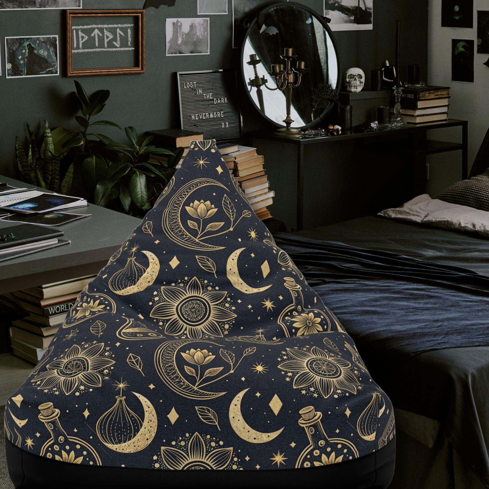 Add a touch of cosmic charm to your cozy corner with this Celestial Witch Bean Bag Cover — where starlit skies meet witchy elegance. Featuring golden moons, potion bottles, flowers, and celestial symbols against a deep black background, this design transforms any room into a space of mystic serenity.