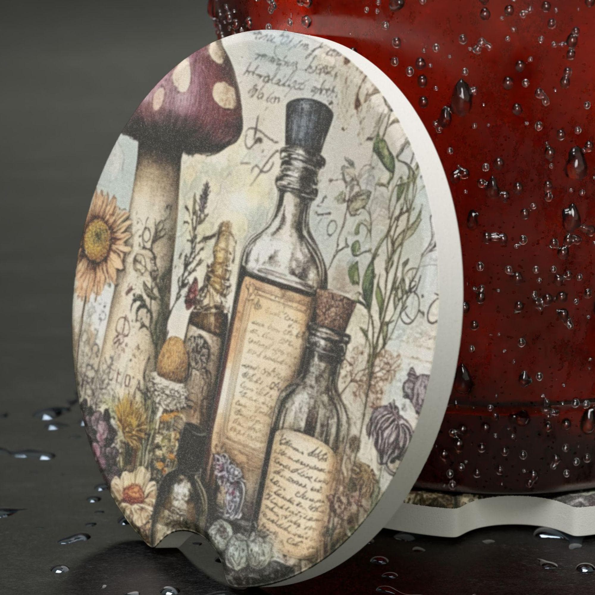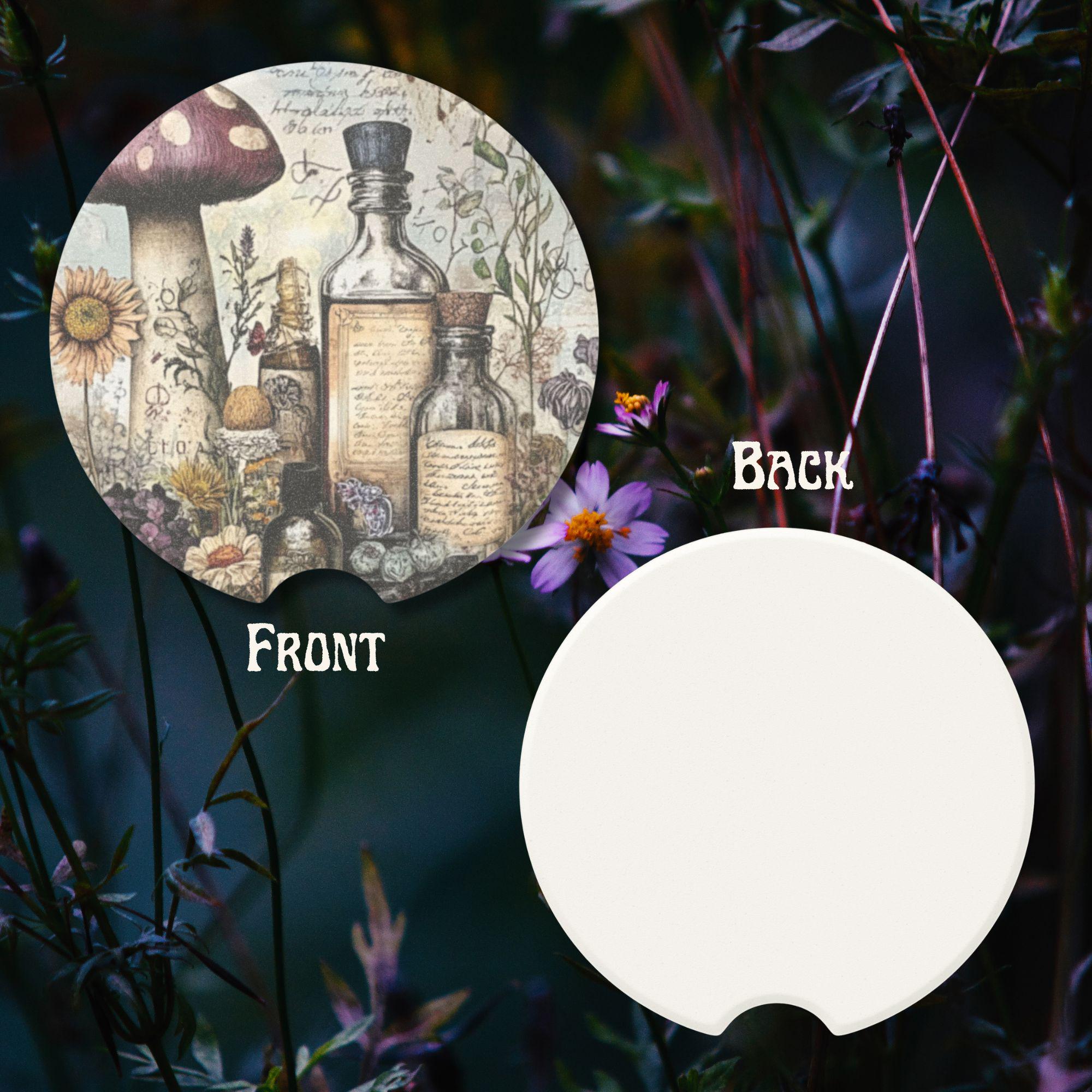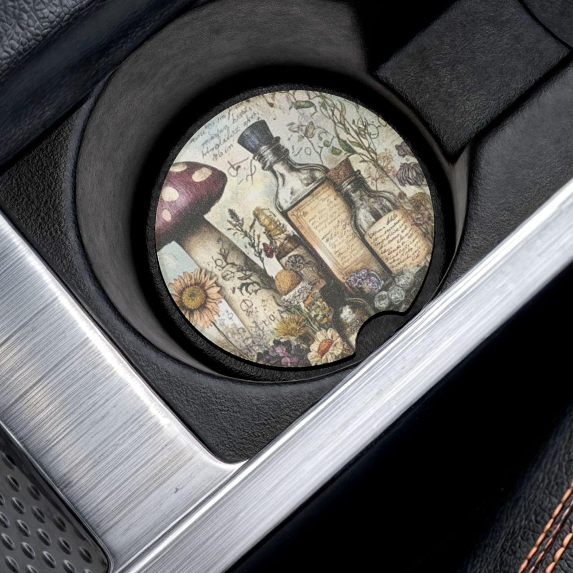 Featuring beautifully illustrated potion bottles, mushrooms, and dried herbs, this design evokes the cozy essence of an old-world apothecary. Crafted from durable, absorbent stone, it keeps your cup holders tidy while adding a dash of enchantment to your daily drives.