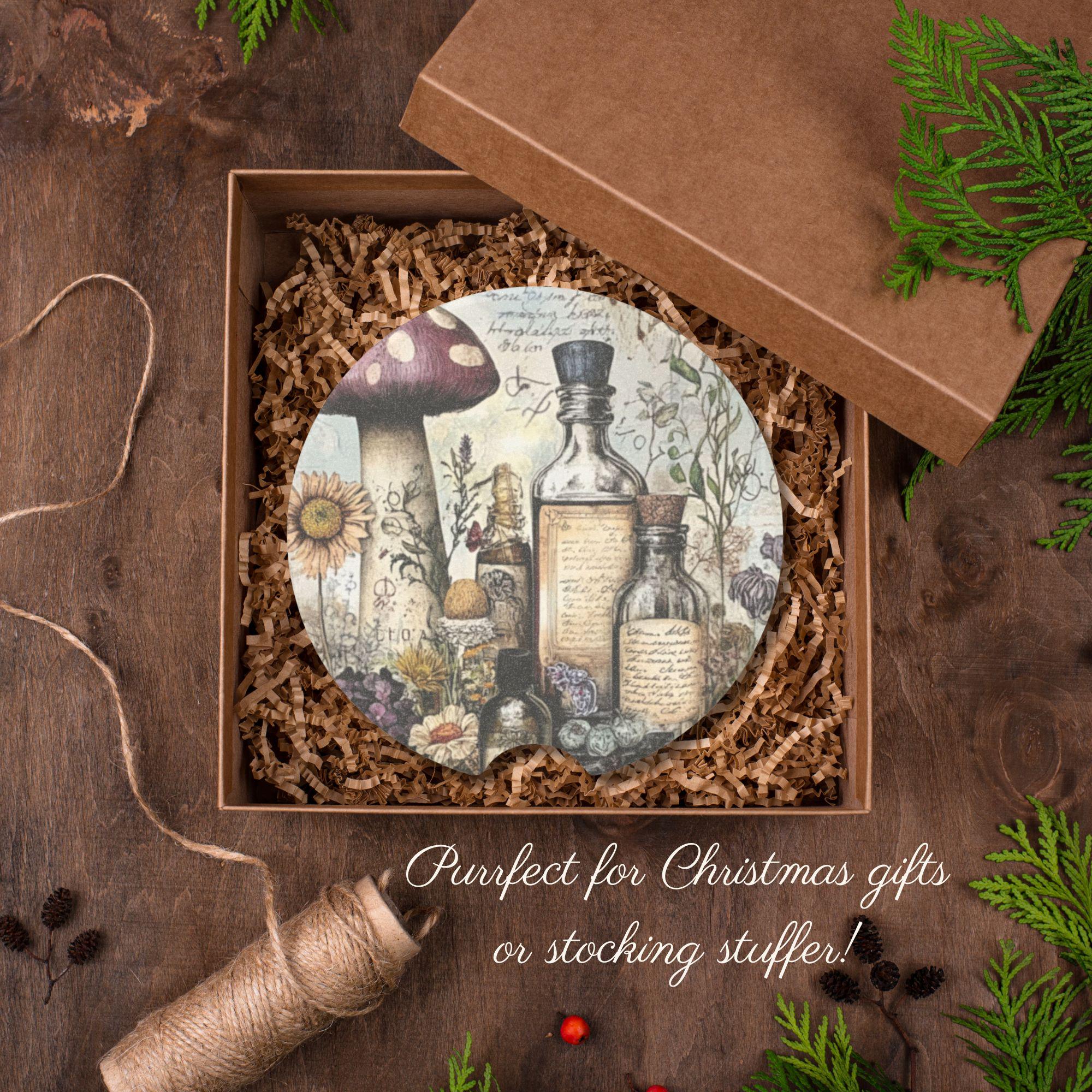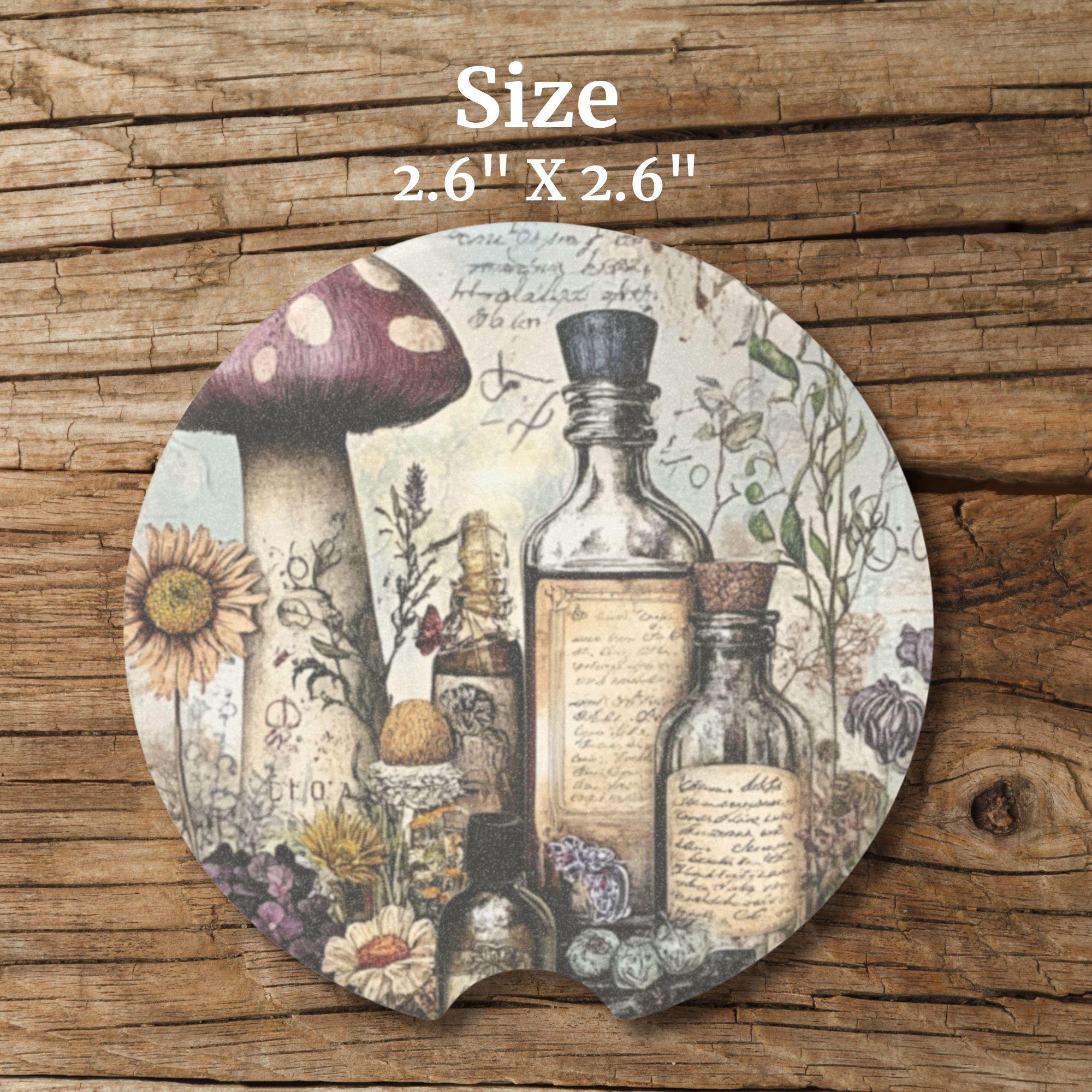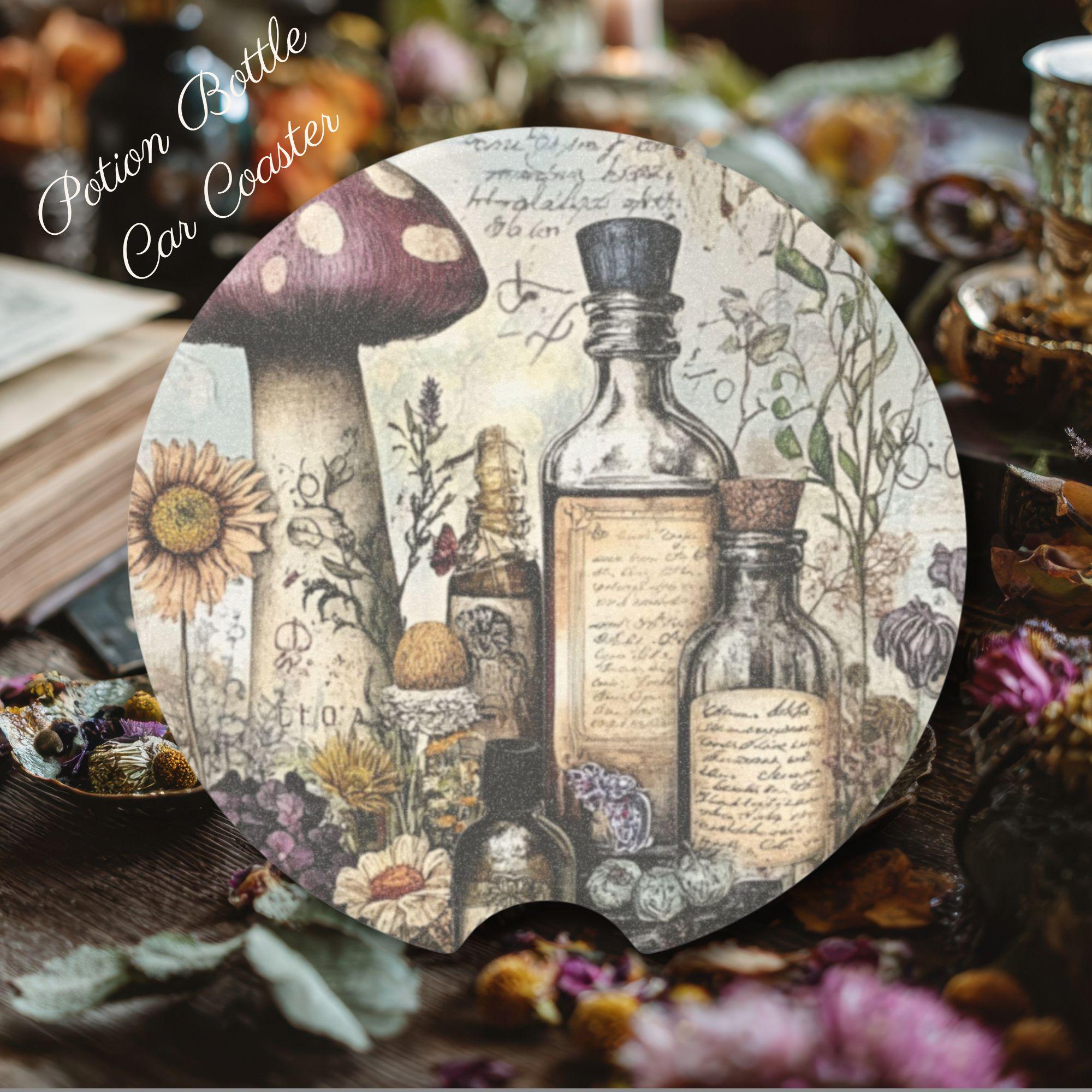 Featuring beautifully illustrated potion bottles, mushrooms, and dried herbs, this design evokes the cozy essence of an old-world apothecary. Crafted from durable, absorbent stone, it keeps your cup holders tidy while adding a dash of enchantment to your daily drives.
