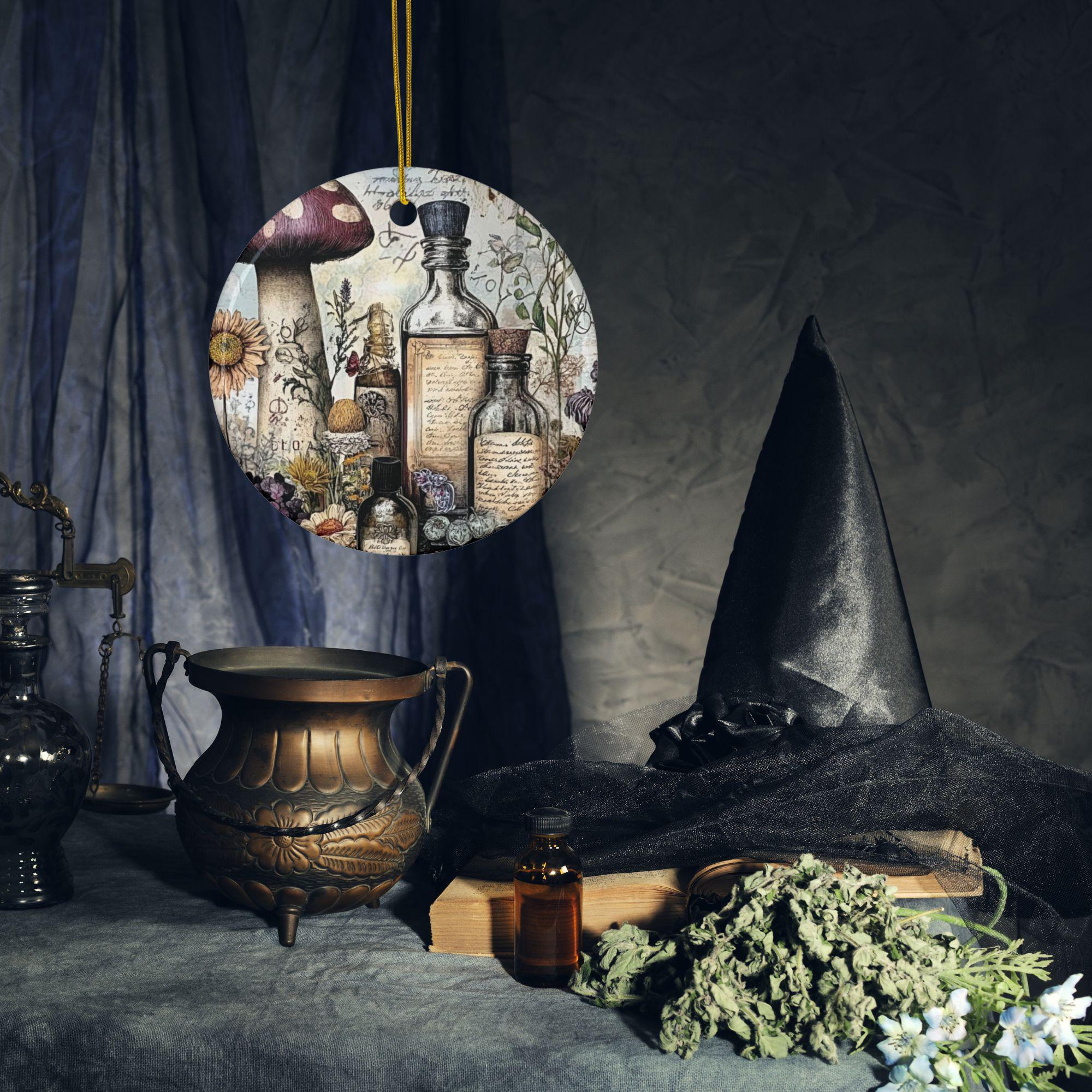 Featuring a beautiful vintage-style design of potion bottles, dried herbs, mushrooms, and floral accents, this ornament captures the spirit of an old-world apothecary — perfect for witches, herbalists, and lovers of all things mystical and cottagecore.